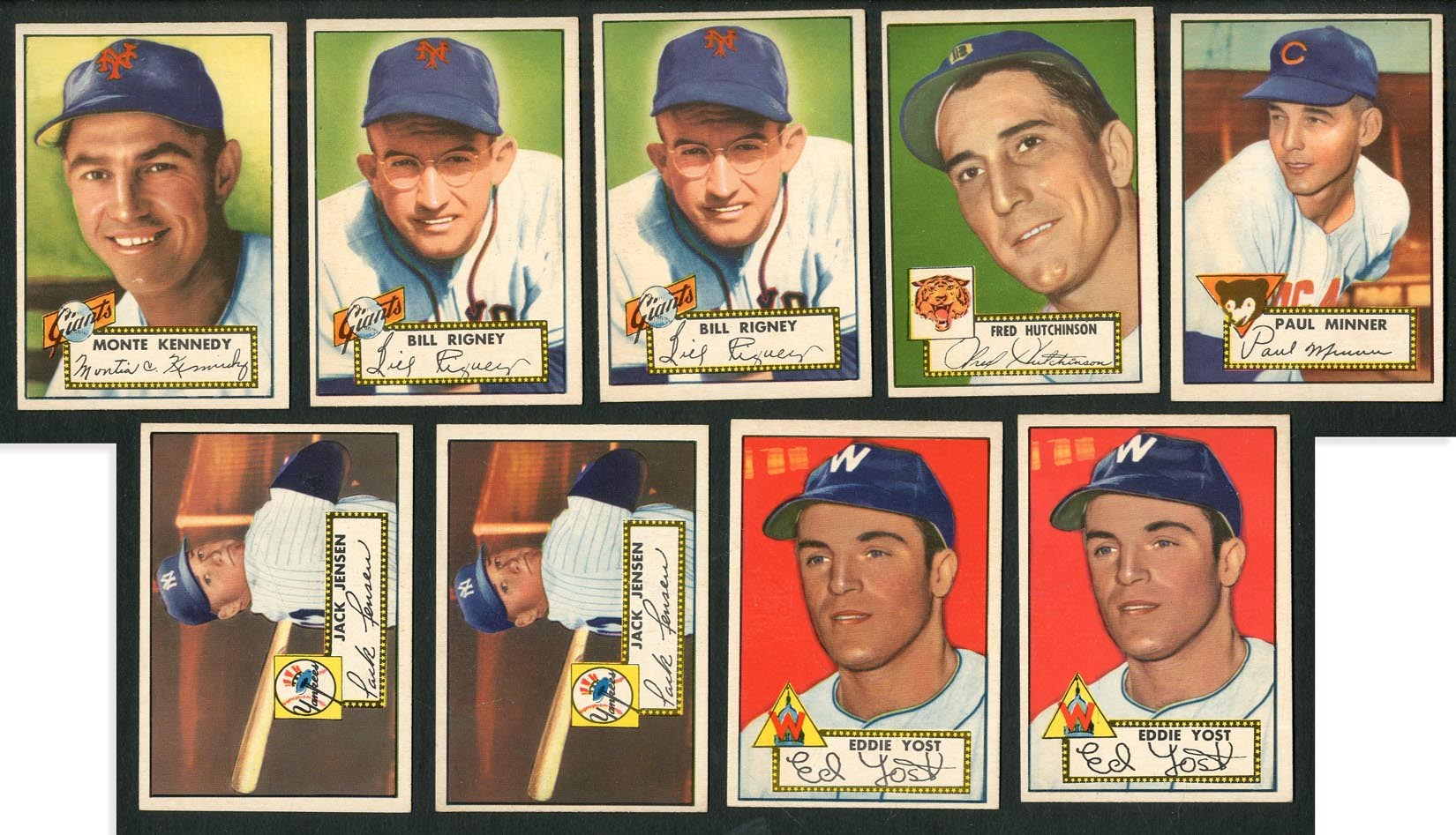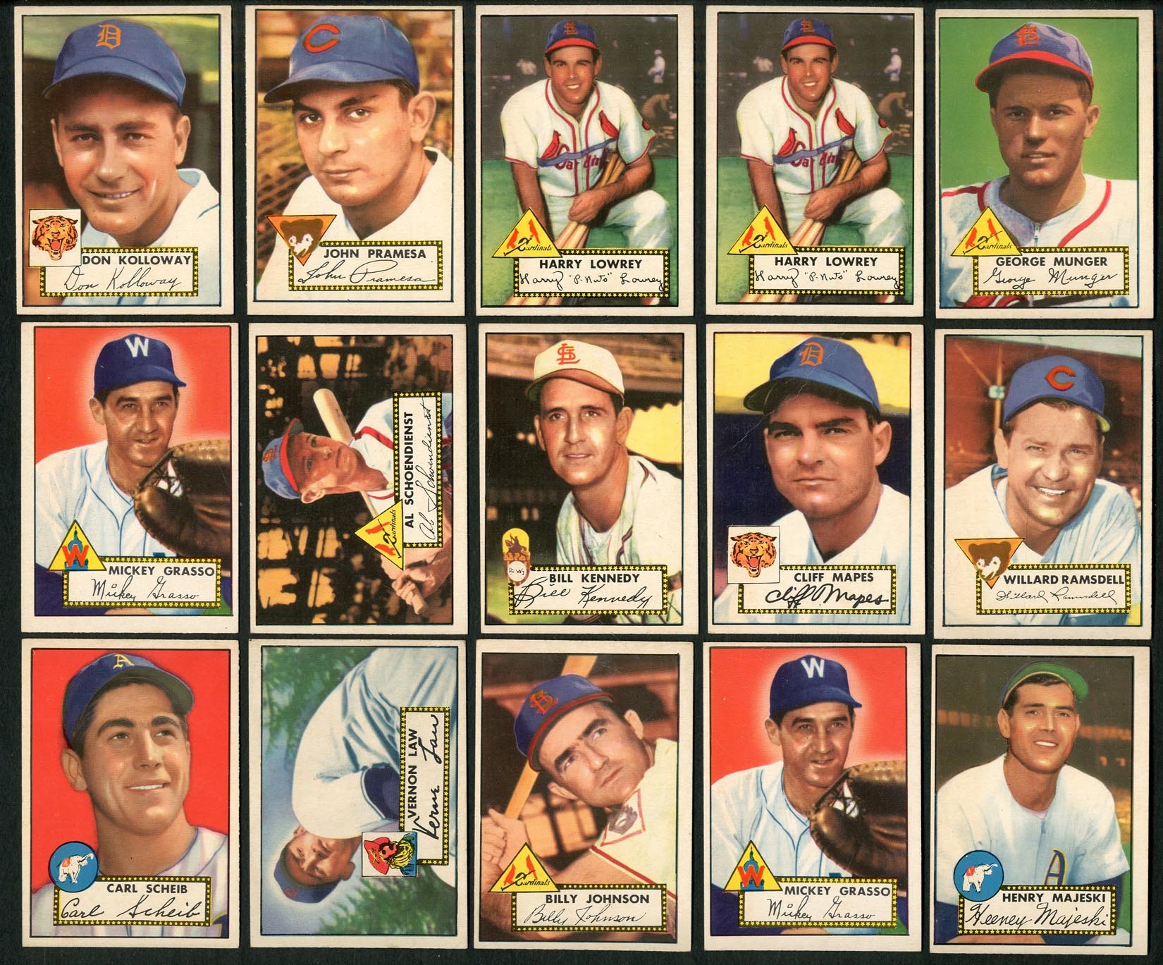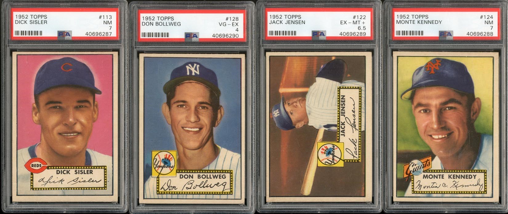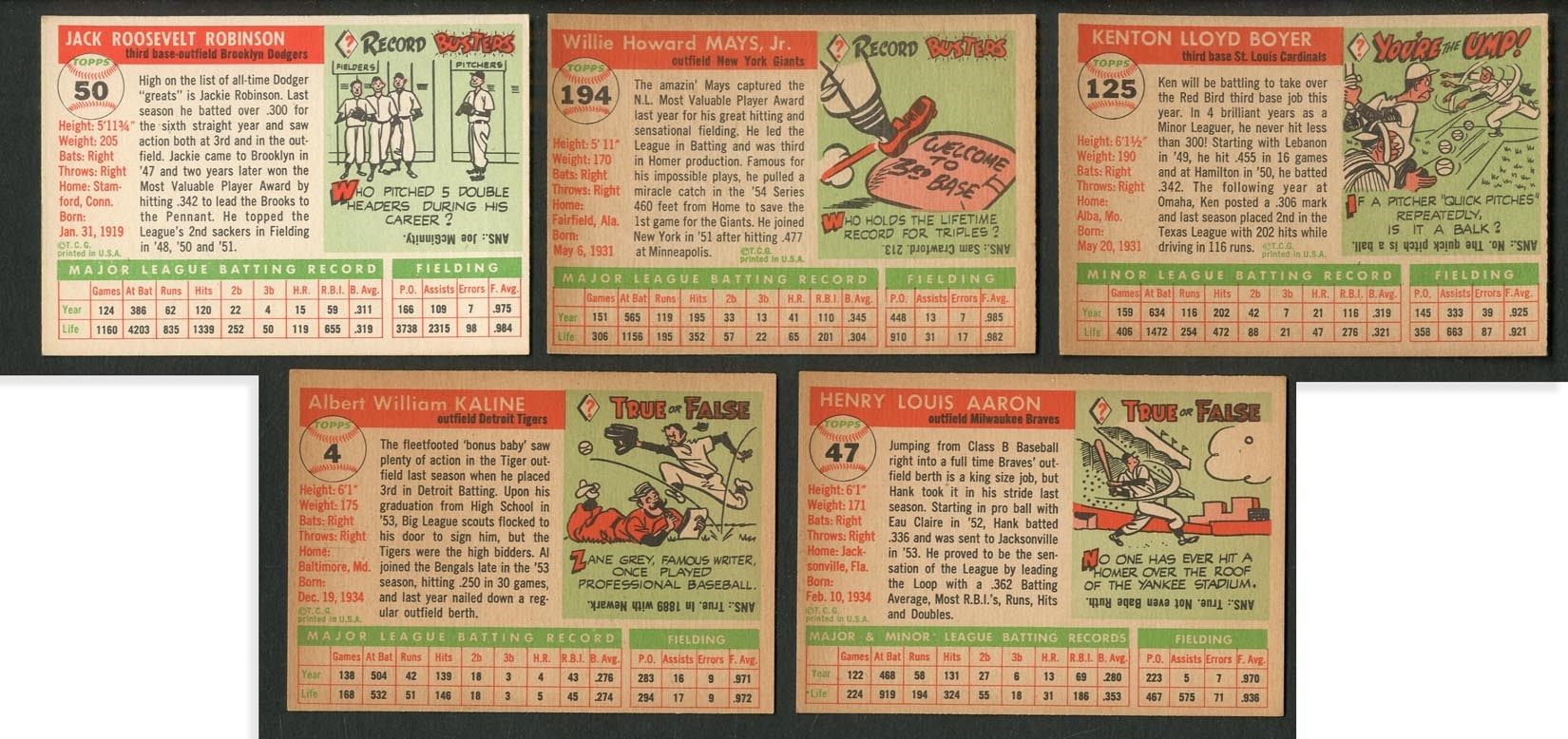 From the same consignor as the 1954 Topps HIGH GRADE fresh collection of cards comes this small group of Topps cards from 1952, 1953 and 1955. As with the 1954 lot, this group of cards was purchased from the store back in 1955 and placed in a box for safe keeping, never being handled like childhood collections normally were handled. Cards exhibit sharp corners, nice color, gloss and focus, appearing very fresh. However, the 1952s are a touch below the 1953s and 1955s, while the 1953s are mostly high numbers and the 1955s have many big name stars. Includes: Graded Cards - 1952 Topps: 4 cards w/#113 Sisler (PSA NM 7), 122 Jensen (PSA EX-MT+ 6.5), 124 (PSA NM 7) and 128 Bollweg (PSA 4). Ungraded Cards - 1952 Topps: 23 cards w/#81, 83, 90 (2), 91 Schoendienst, 103, 104, 105, 111 (2), 112, 114, 115, 116, 122 (2), 123 (2), 124, 125 (2), 126 and 127. Grades mostly EX/MT to NM. 1953 Topps: 60 cards (40 High Numbers!) w/#94, 107, 145, 172, 173, 175 (2), 182, 184, 188, 189, 195, 200, 205, 206, 210, 211, 214, 217, 218.....222 (3), 223 (2), 226, 229, 231, 232, 234, 235, 236 (2), 239 (2), 240, 241 (2), 242 Silvera, 245, 247, 248, 249, 251, 254 Roe (5), 257, 259, 260 (2), 262, 264 Woodling, 274, 276, 278 (3). Grades EX/MT to NM/MT, a few lesser. 1955 Topps: HOFers/Stars - 5 cards w/#4 Kaline (NM corners, band marks - VG/EX), 47 Aaron (NM corners, 80/20), 50 Robinson (appears NM with vertical crease), 125 Boyer RC (NM/MT corners, 80/20) and 194 Mays (NM/MT corners, 90/10). OTHERS - 83 cards (21 high numbers!) w/#1 Rhodes (VG), 6, 12, 13, 15, 17, 21 (4), 27, 35, 41, 43, 44, 45 (2), 53, 58, 65, 67, 69 (2), 76 (2), 79, 85, 86, 87, 88, 90 Spooner, 93, 95, 96 (2), 102, 103, 105 (2), 107 (3), 108, 109, 118 (2), 119, 121 (2), 128, 130 (2), 133, 135, 137 (3), 140, 143 (2), 145 (2)....158, 165, 166 Bauer, 170 (3), 172, 177, 178 (2), 183, 188 Silvera (2), 191, 192 (2), 197, 199, 202, 205 and 208. Grades mostly EX/MT to NM, with some better. Total of 170 cards.