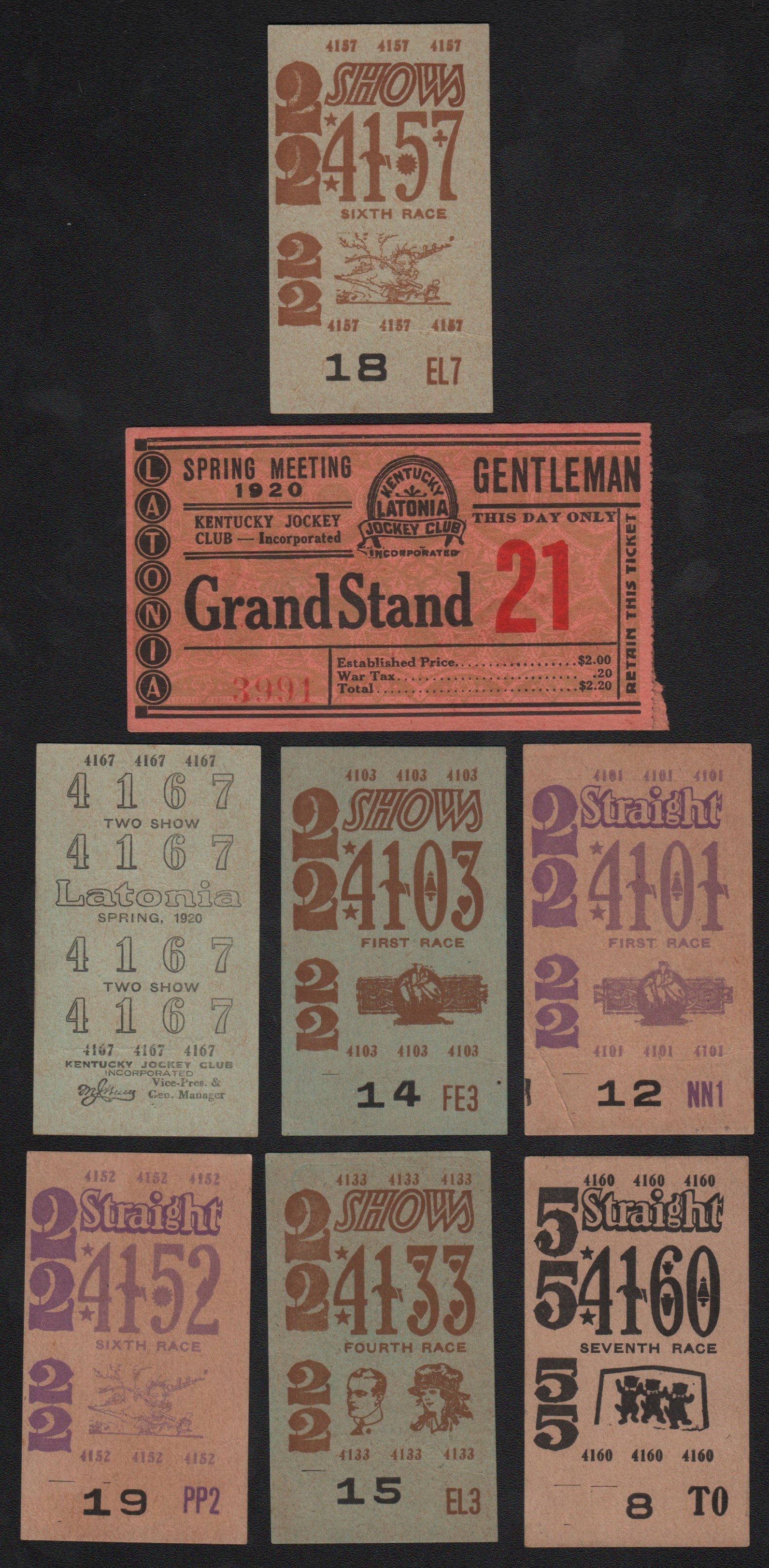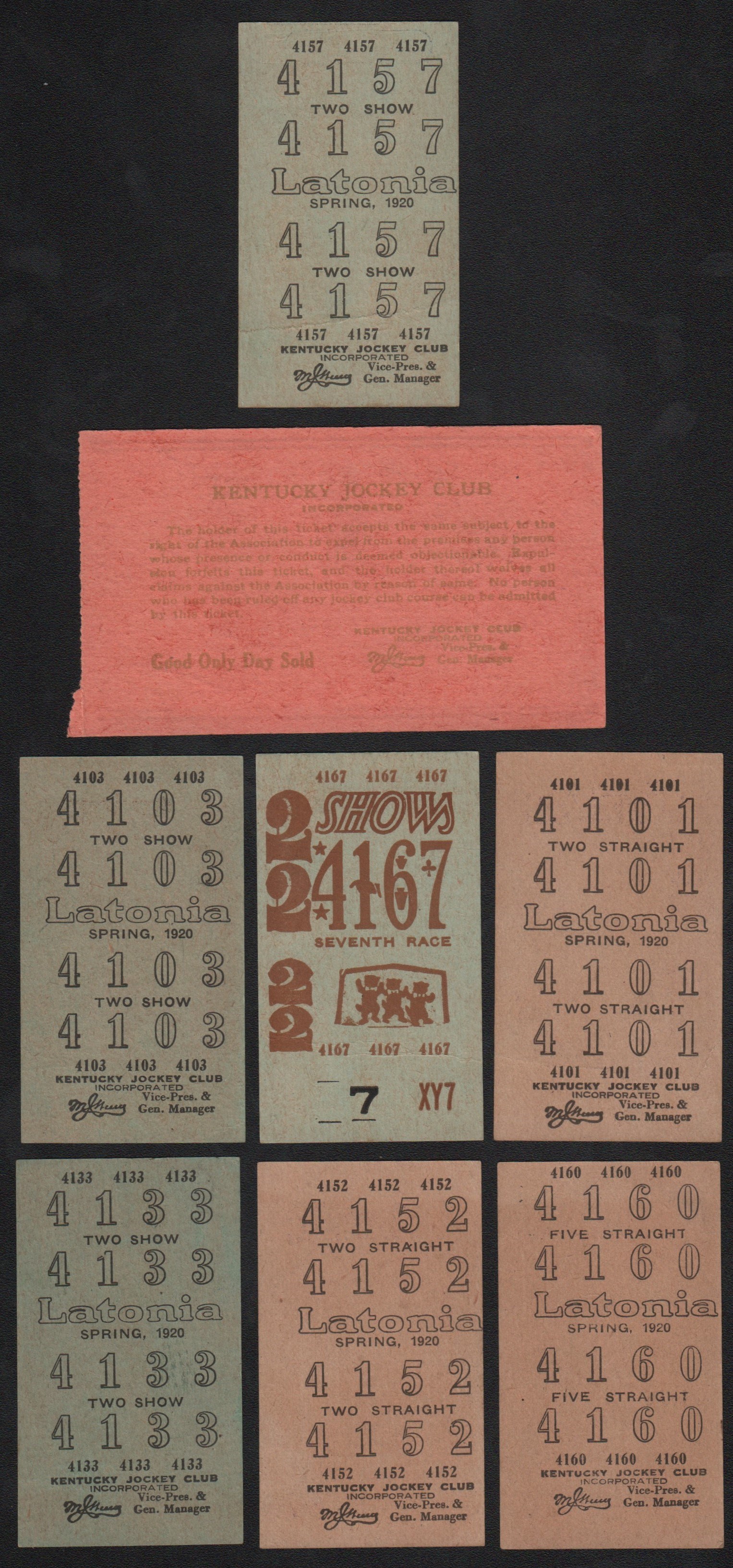 Incredible collection of 7 Pari-Mutuel betting tickets plus one Grand stand ticket stub for the Kentucky Jockey Club from 1920.  Tickets are all in NRMT condition (1 w/crease in lower left corner).