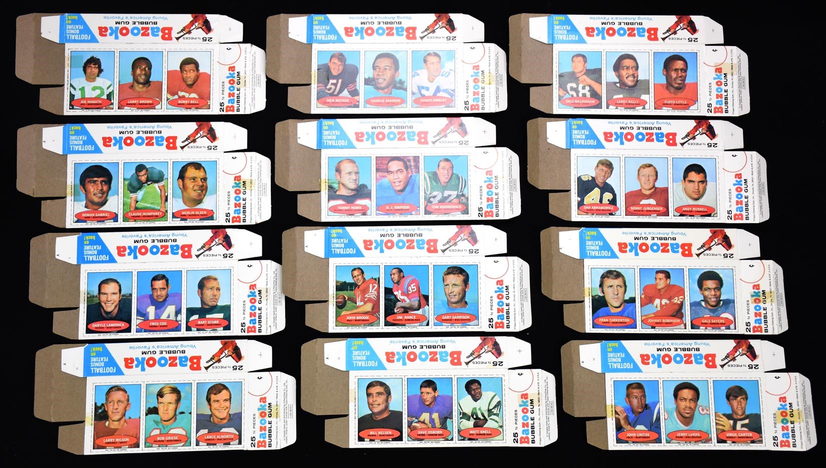 Presented is a complete set of 12 boxes from the scarce 1971 Bazooka football cards set. With three cards per box, the set of 36 cards includes 17 Hall of Famers, many of the biggest names in the sport. Similar to the 1960s Bazooka baseball cards, this football issue, the first Bazooka football set since 1959, is much more scarce than its baseball counterparts. Leading off with Joe Namath, the 36-card set also includes Bart Starr, Johnny Unitas, Gale Sayers, Dick Butkus and OJ Simpson. As is standard with this issue, factory provided tape is on 10 of the boxes, mostly applied to the first card of the panel, which includes tape on cards of Namath, Tarkenton and Unitas. One of the boxes does not have any tape applied (10-12). While the complete boxes display well, the technical grades of the cards range from VG to EX, with minor creases and dings on a third of the boxes plus the aforementioned tape. One box would grade GOOD with multiple creases. Still, despite the above, this is one tough set to find and/or complete, and would make a worthy Canton-style entrance and addition to your collection.