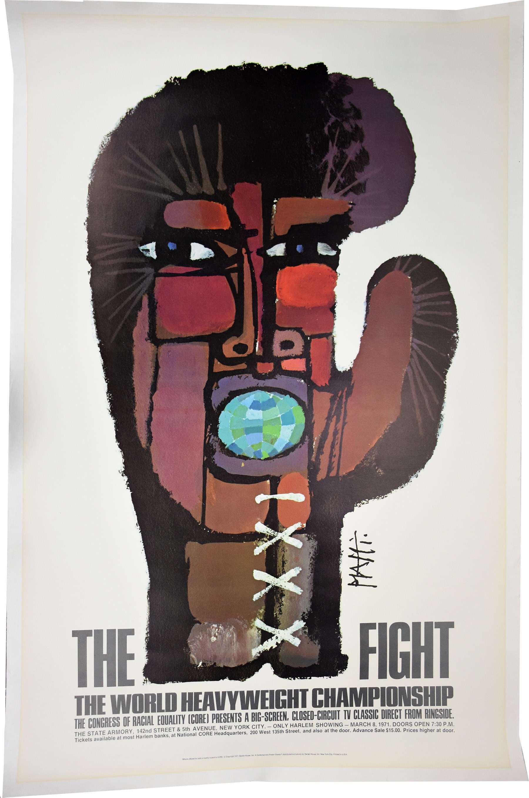 Exceptional 1-sheet poster, professionally mounted on linen, from the 1971 closed circuit viewing of Ali versus Frazier at the State Armory in Harlem. Poster is by Swiss artist Celestino Piatti and is in NRMT-MT condition.
