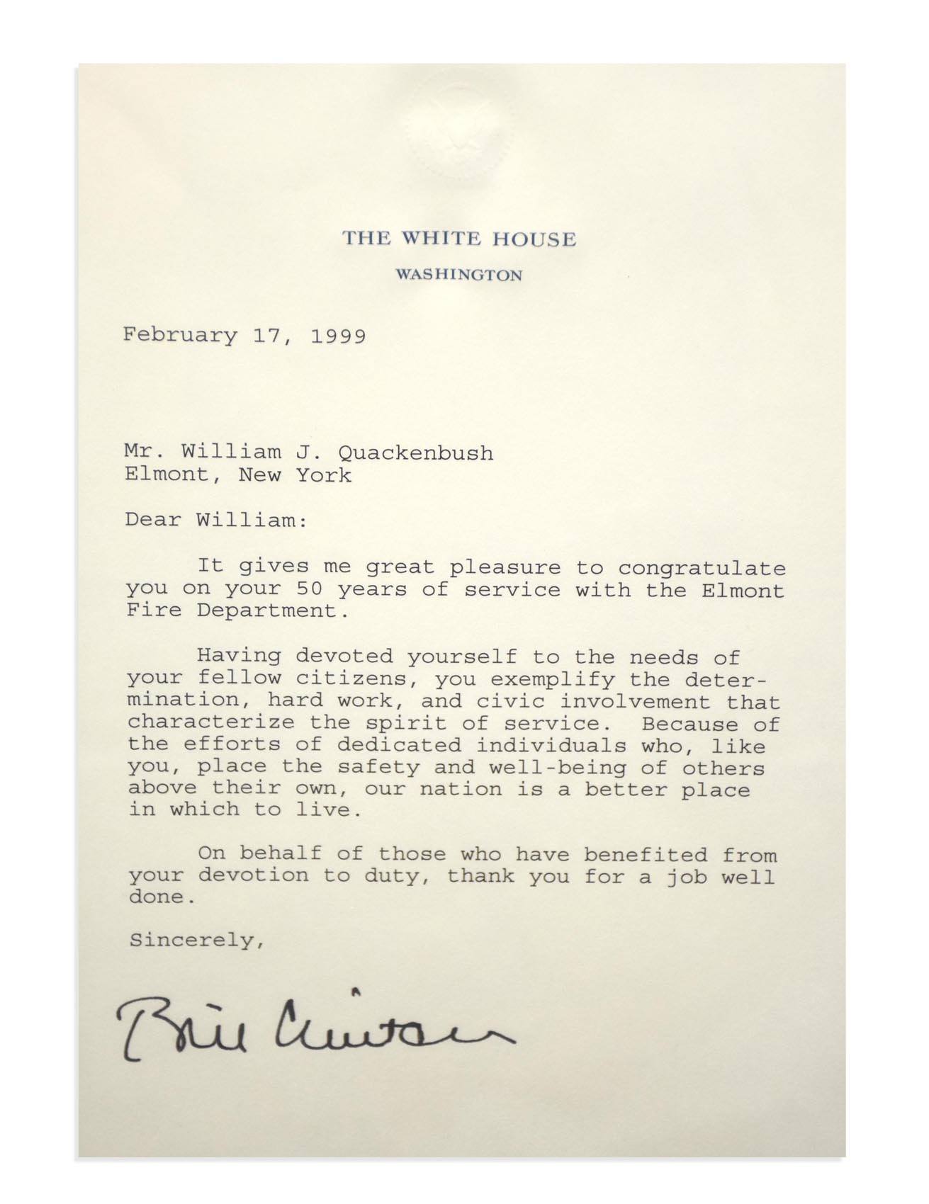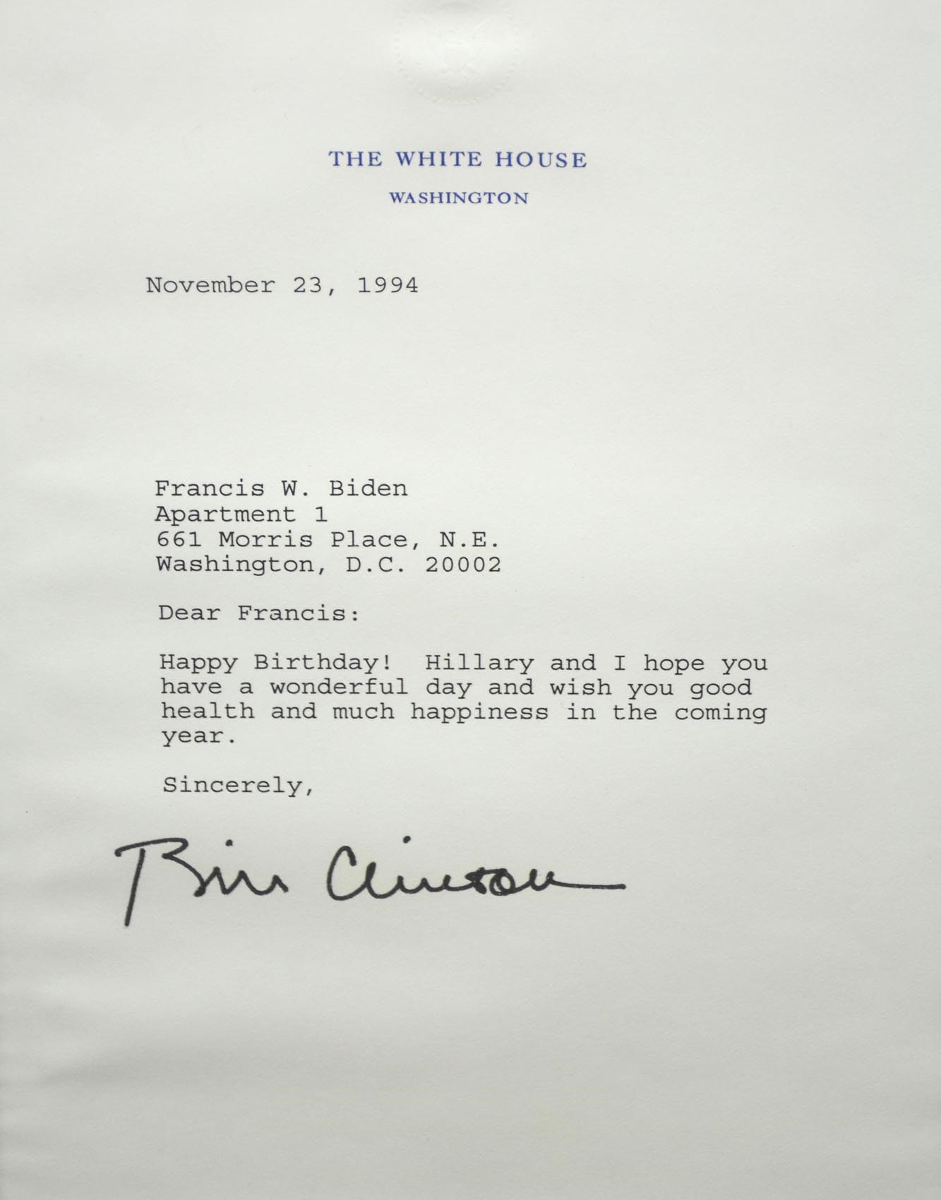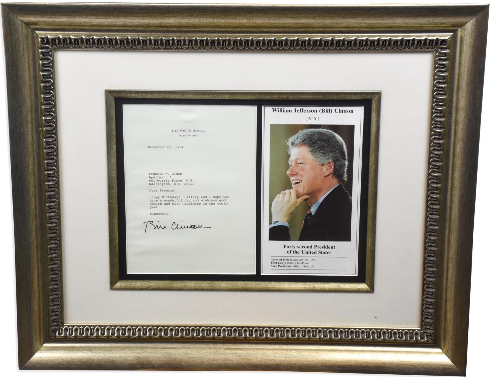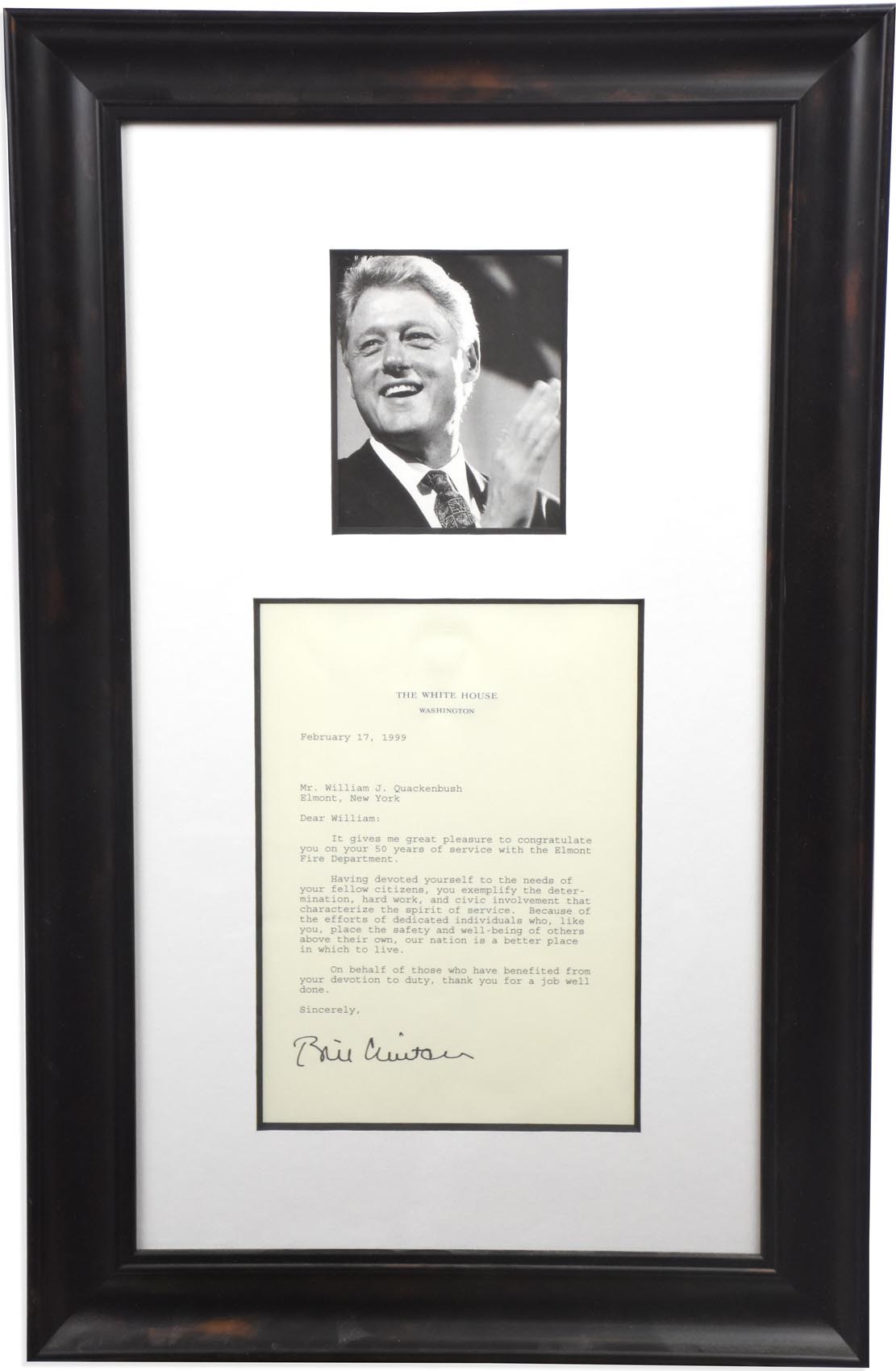 Two signed in autopen framed letters from Bill Clinton, the 42nd President of the United States. One is dated February 17, 1999, which is 5 days after he was acquitted, and the other is dated November 23, 1994. Both are on White House stationary and have been framed (13.5x21" and 18x22", each with a matted photo). One letter is addressed to an Elmont, NY fireman and the other is to a Mrs. Biden, wishing her a happy birthday.