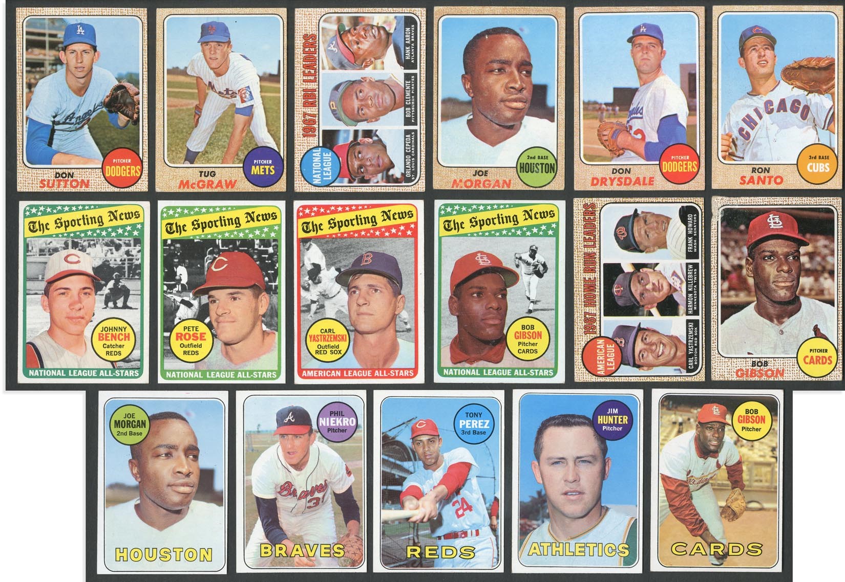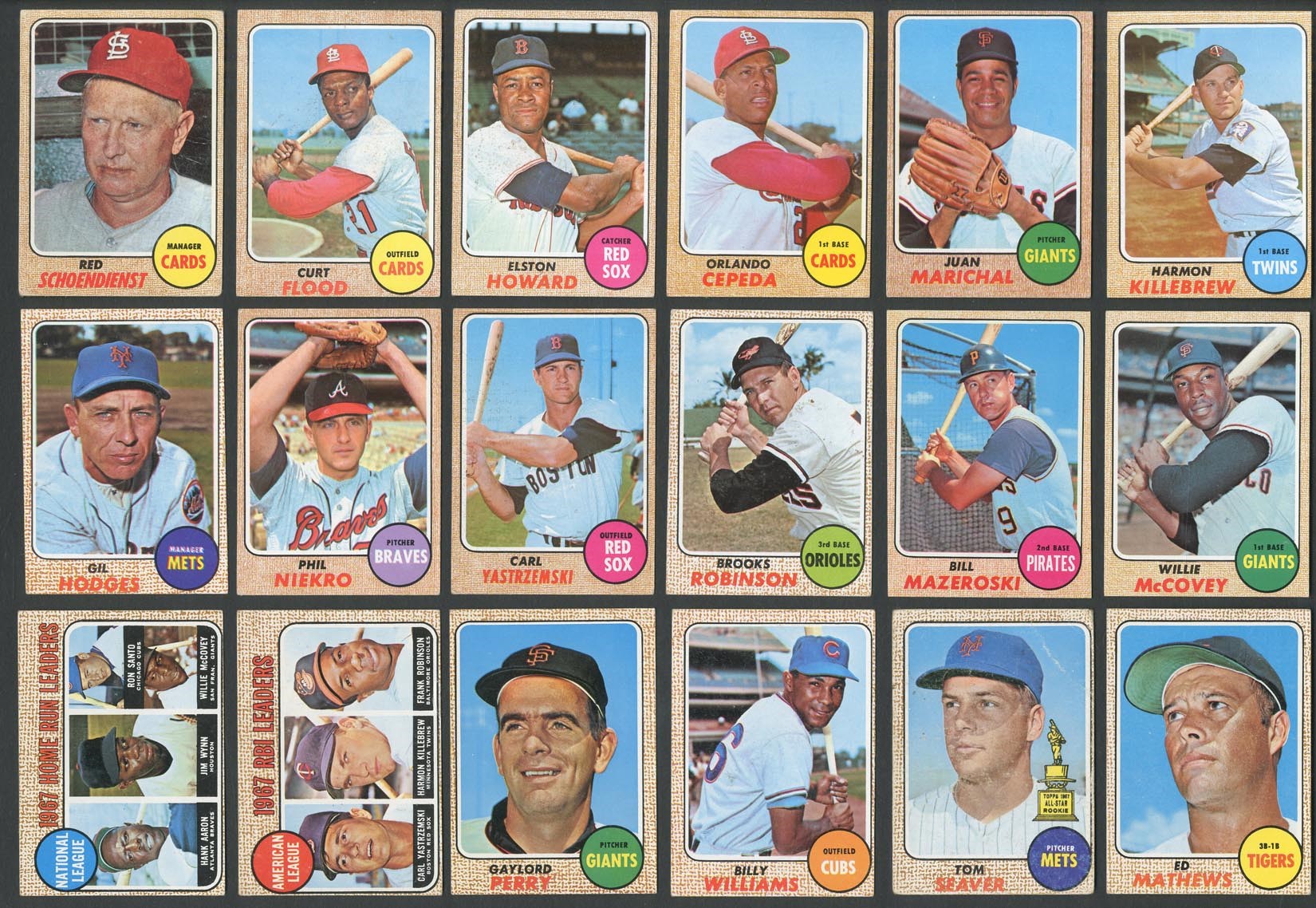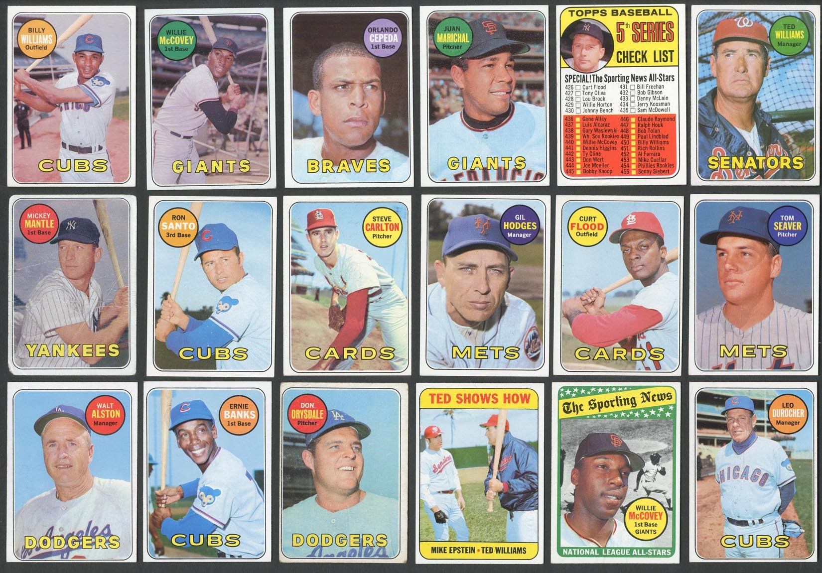 Offered here are two partial sets of 1968 and 1969 Topps baseball. There are 611/664 cards from 1969 Topps and 445/598 cards from 1968 Topps including the key cards like Mantle, Williams, Banks, Seaver and more. A sample of the better cards from the 1969 set are listed here: Mantle (poor), Williams, Banks, Drysdale, Seaver, McCovey, Gibson, Ted Williams Shows How, 5th Series Checklist w/Mantle, B. Williams, Hodges, Santo, Carlton, Morgan, Alston, Niekro, Marichal, Cepeda, Flood Perez, Durocher, Hunter, Jenkins, Murcer. Sporting News All-Stars: Yaz, Bench, Rose, McCovey, Gibson. The 1969 cards are overall EX-MT with many NM or better. This is a breakdown of the 1968 Topps: Seaver, Drysdale, McCovey, Mathews, Yastrzemski, Perry, Hodges, B. Williams, B. Robinson, Niekro, Schoendienst, Howard, Flood, Maz, Cepeda, Marichal, Killebrew, Santo, McGraw, Morgan, Sutton, Gibson, NL RBI Leaders w/Aaron & Clemente, NL HR Leaders w/Aaron. The 1968 Topps cards are overall EX.