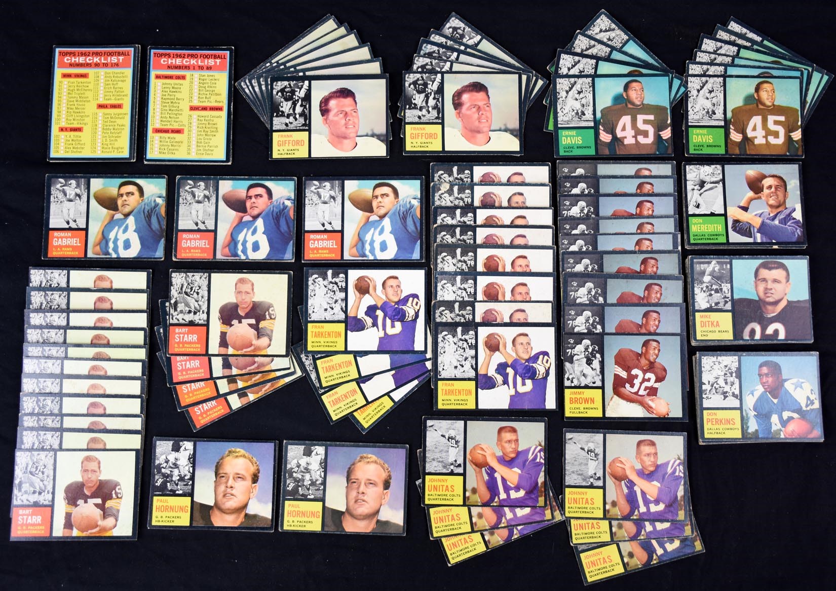 1962 Topps football card collection of over 1,500+ cards. Highlights include: #1 Unitas (6); #17 Ditka R (11); #28 Jim Brown (8); Ernie Davis R (10); #39 Don Meredith (7); #41 Perkins (14); #63 Bart Starr (15); #64 Paul Hornung (8); #76 Checklist (5); #88 Roman Gabriel R (9); #90 Fran Tarkenton R (12); #104 Frank Gifford (12) and; #176 Checklist (6). Overall VG-EX+