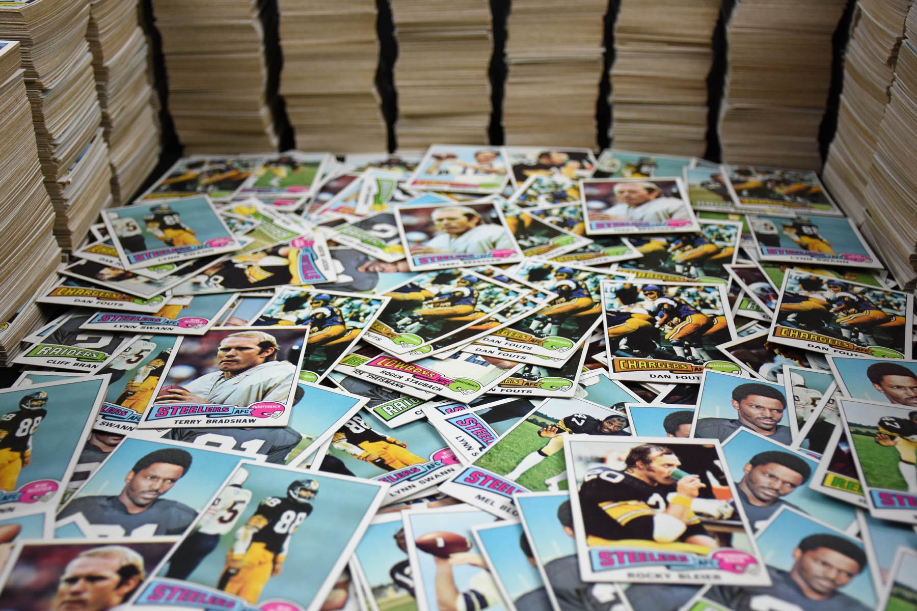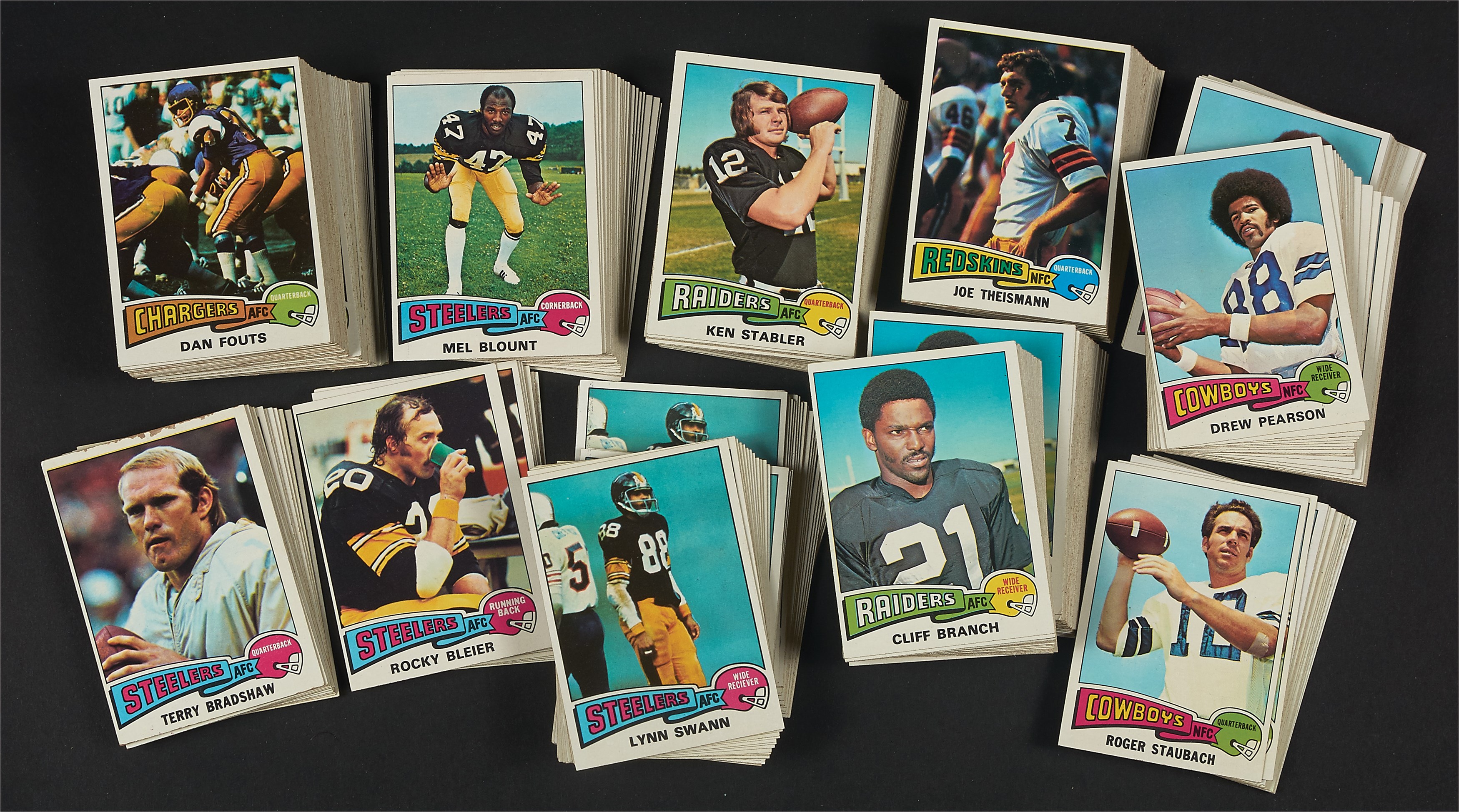Giant collection of 1975 Topps football cards. This absolutely fresh to the market collection is a must view and promises to offer up some great finds. Large quantities of pretty much everyone including: #12 Mel Blount R (24); #39 Rocky Bleier (8); #65 Drew Pearson R (74); #145 Roger Staubach (12); #282 Lynn Swann R (42); #367 Dan Fouts R (49); #380 Ken Stabler (31); #416 Joe Theisman (29); #461 Terry Bradshaw (13) and; #524 Cliff Branch R (60). All are NM or better and from packs and vending.