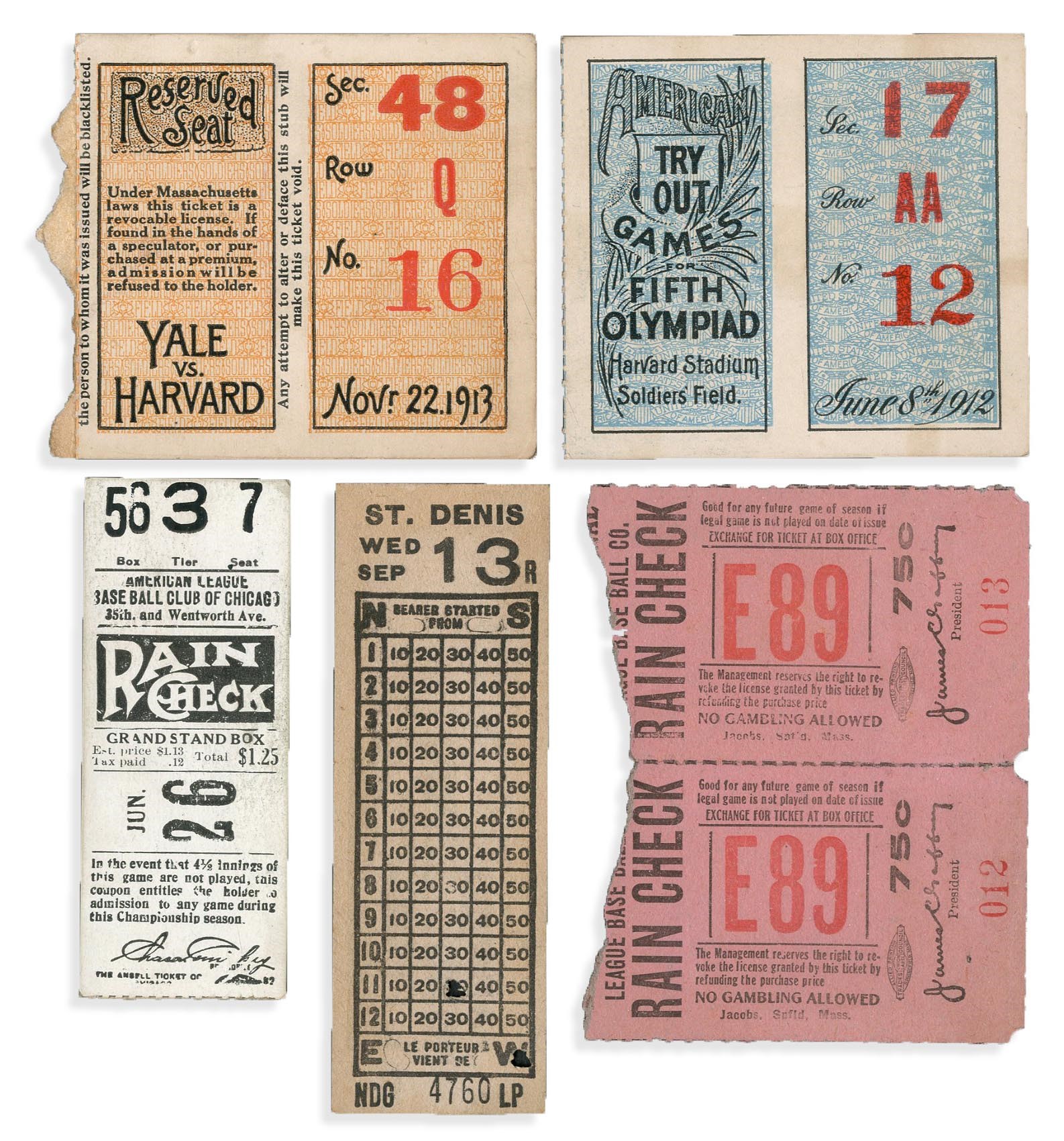 1912-13 sport ticket collection includes: 1912 Olympic Try Outs at Harvard stadium, 1913 Harvard-Yale game, two attached Boston Braves (James Gaffney President), June 26th at Chicago White Sox, and a French train ticket for character. Overall EX.