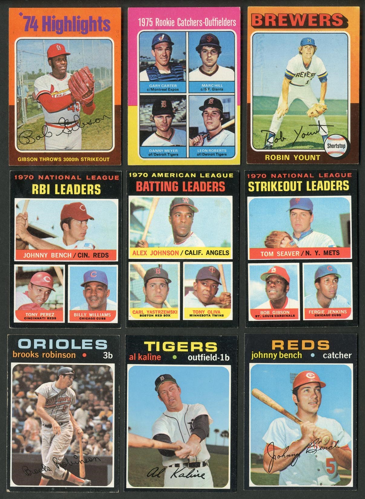 Nice array of 1970s Topps baseball cards with some major stars. 1970 Topps (80+) includes few stars, 1971 Topps (125+) includes some stars like Bench & Gibson, 1972 Topps (70+) includes stars, 1973 Topps (1200+) includes major stars but no Schmidt rookie. The stars in the mentioned sets include Hank Aaron, Pete Rose, Johnny Bench and more. There are other random assorted stars from the 1970s with Yount RC and Carter RC. Overall EX condition with the 1971s being surprisingly nice.