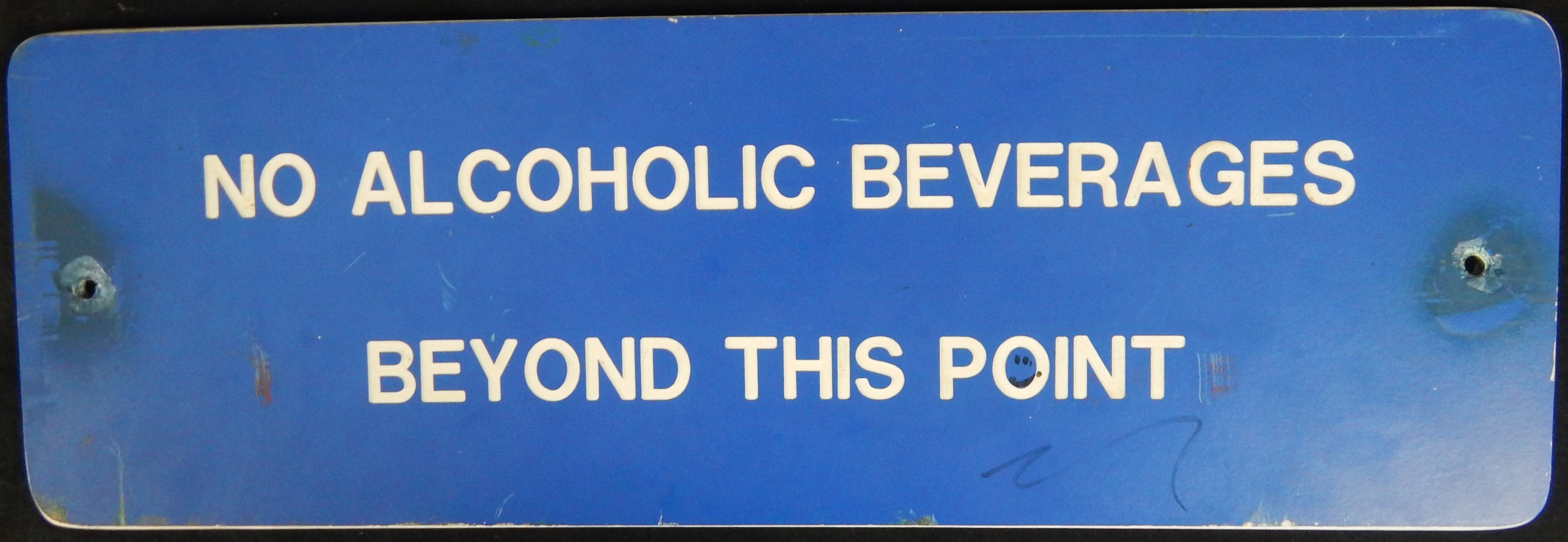 Nice Maple Leafs blue "No Alcoholic Beverages Beyond This Point" sign that hung in Maple Leafs Gardens. Clear wear on it, especially around the screw holes. Obtained from high level NHL executive.