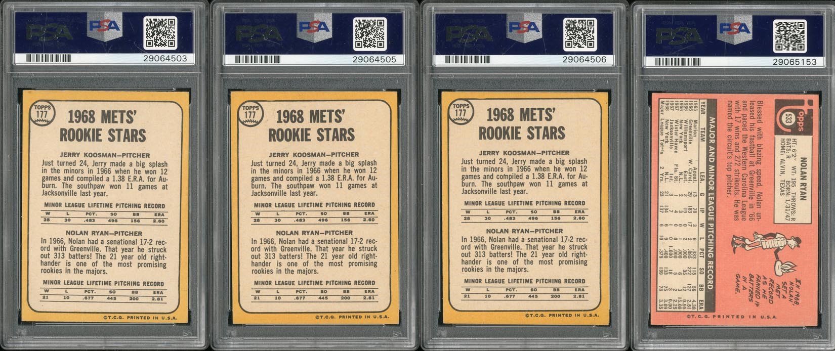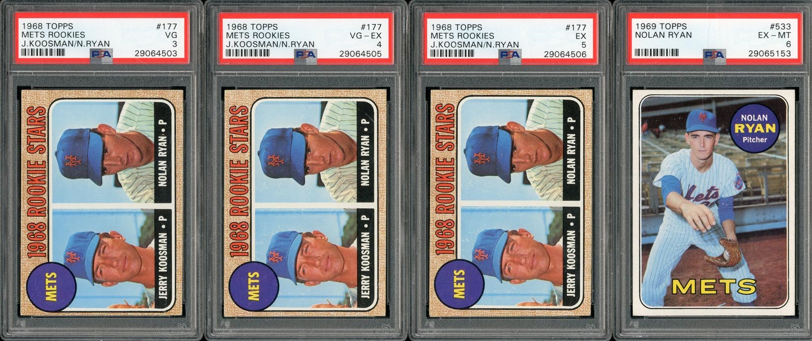 Four freshly graded Nolan Ryan cards, from a long time collection. Includes: 1) 1968 Topps #177 Nolan Ryan RC (PSA EX 5). 2) 1968 Topps #177 Nolan Ryan RC (PSA VG-EX 4). 3) 1968 Topps #177 Nolan Ryan RC (PSA VG 3). 4) 1969 Topps #533 Nolan Ryan (PSA EX 5). Several cards appear under-graded, specifically the 1969 card.