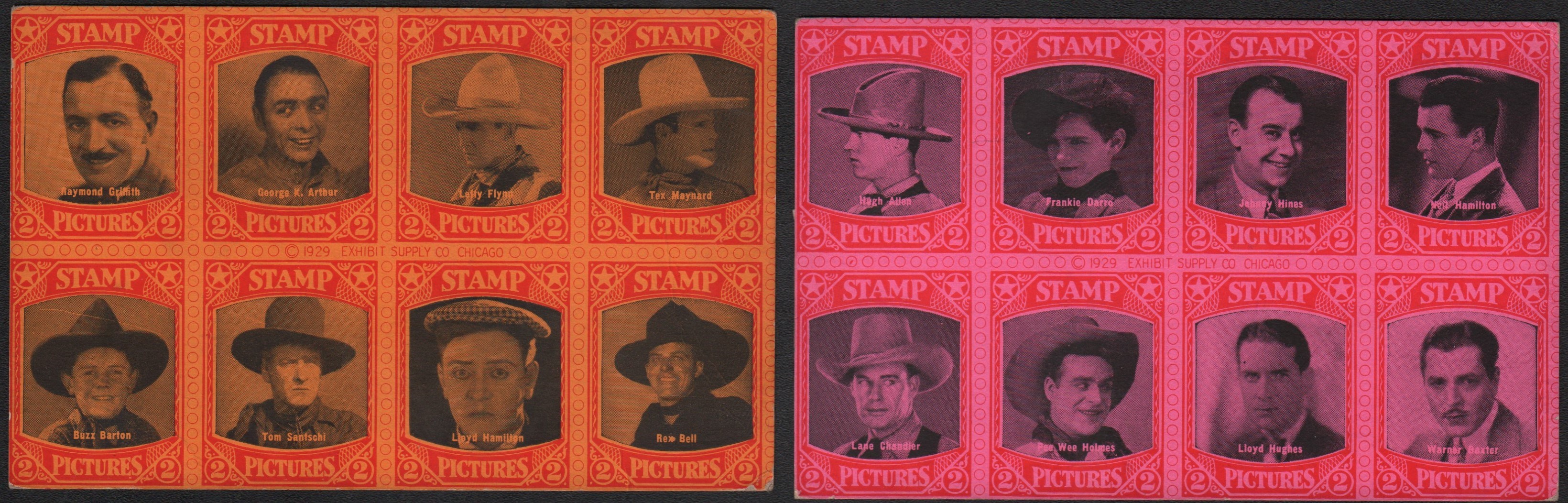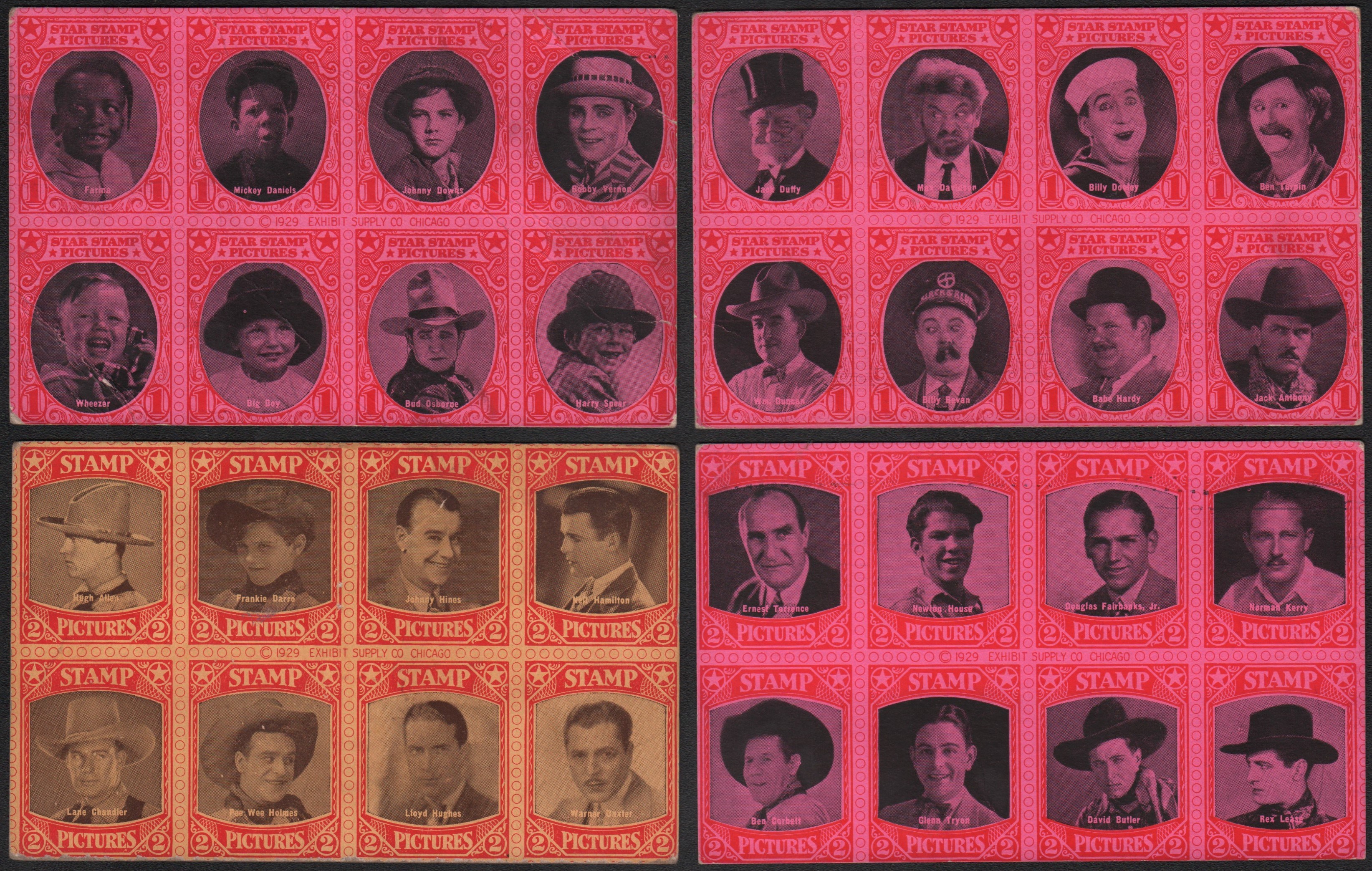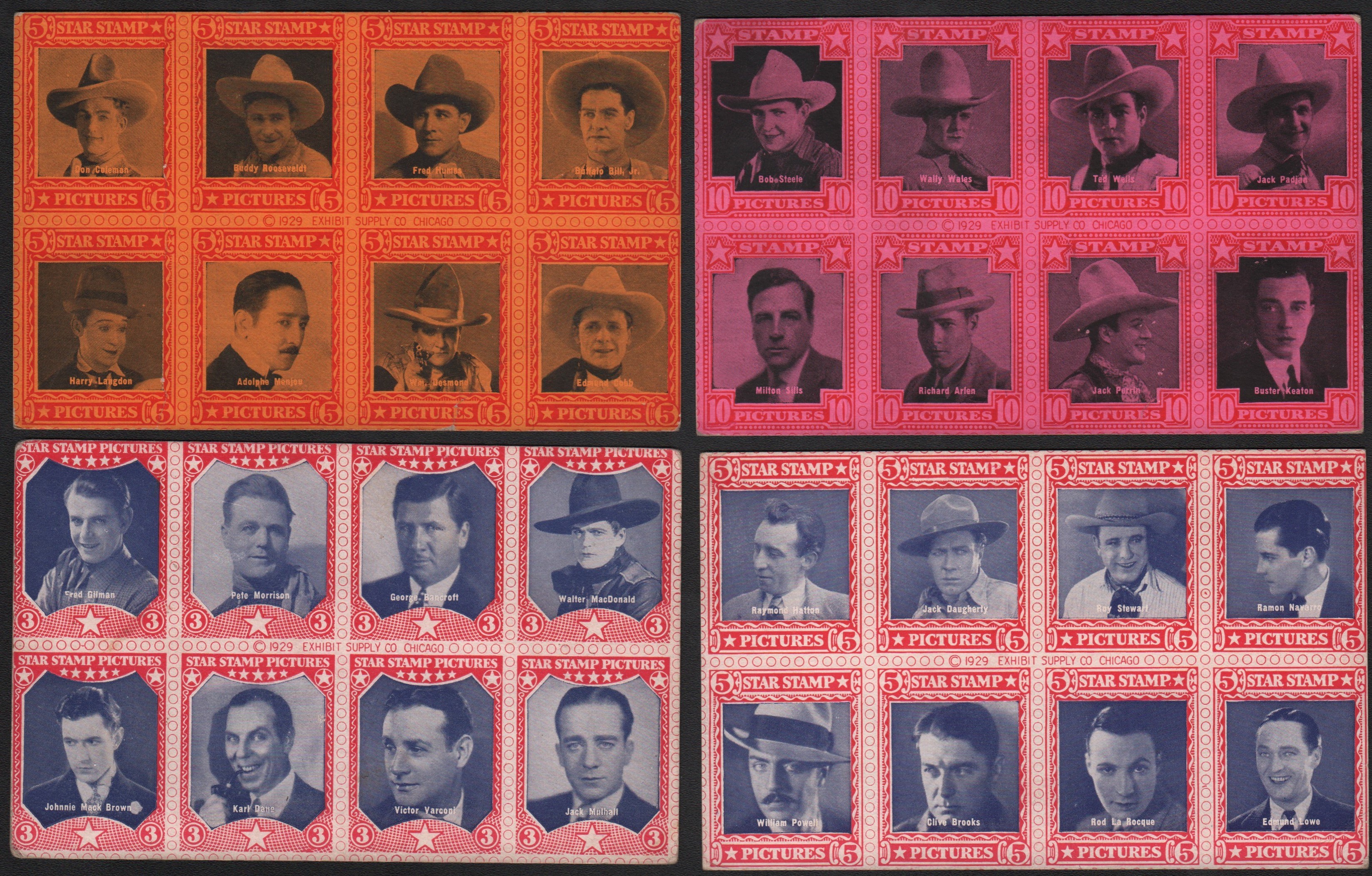 The backs all have the identical style of the 1929-30 Baseball 4-in-1's with the standard postcard, but with the Exhibits coupon stamp in one corner. The “50” denomination includes the “big names” Ruth, Tom Mix, Lindbergh, Chaplin, Dempsey, Lloyd, Fairbanks and Jolson and has been graded SGC 40 VG 3. The balance of the set averages excellent and has better names such as Joe Cobb (Our Gang), Wm Hart, Ben Turpin, Oliver Hardy, Tex Maynard, Harry Langdon, Adolf Menjou, Wm Powell, Gary Cooper, Buster Keaton, Eddie Cantor, Lon Chaney, WC Fields, Hoot Gibson, Ken Maynard, Wm Boyd, Buck Jones, Will Rogers, John Barrymore. There are 4 additional color variations.