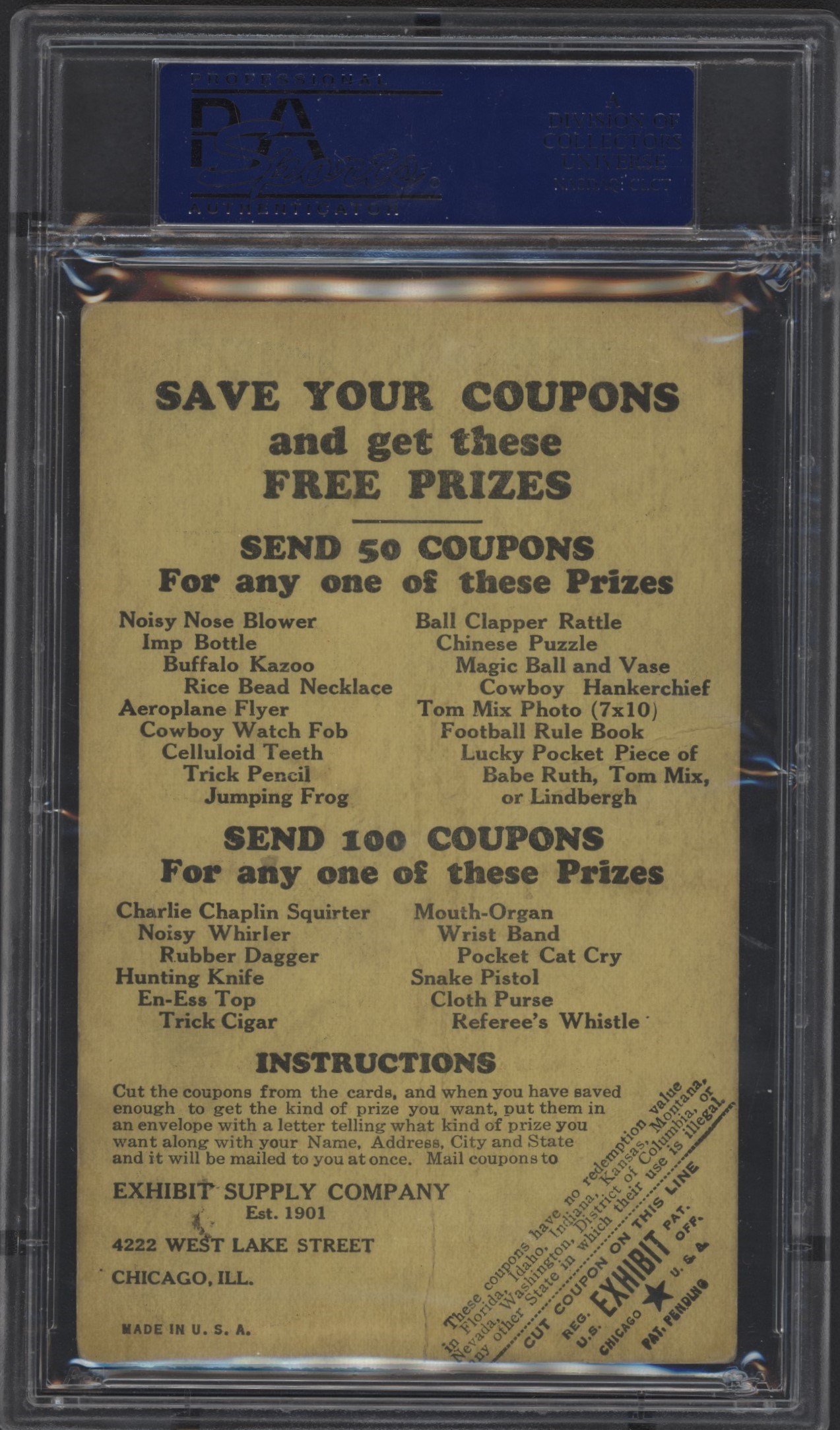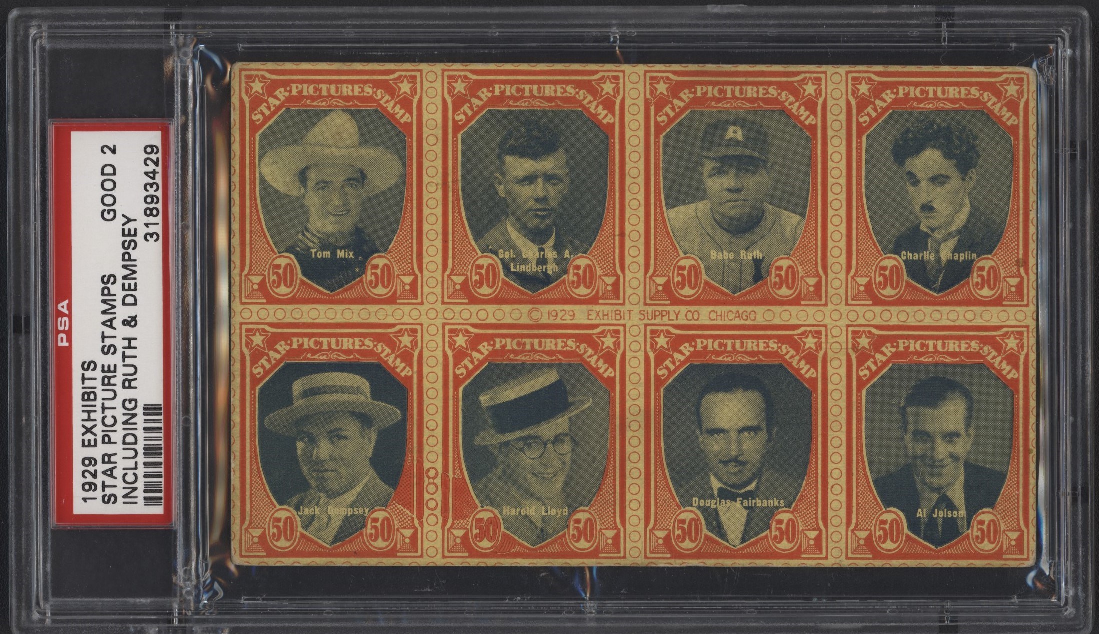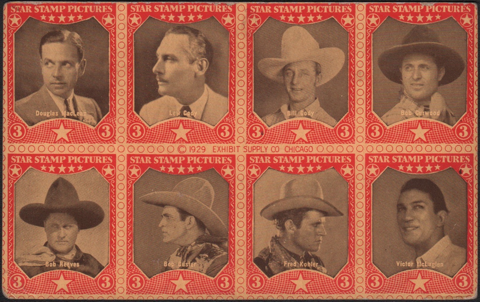 The backs all have the identical style of the 1929-30 Baseball 4-in-1's with the standard postcard, but with the Exhibits coupon stamp in one corner. The “50” denomination includes the “big names” Ruth, Tom Mix, Lindbergh, Chaplin, Dempsey, Lloyd, Fairbanks and Jolson and has been graded SGC 40 VG 3. The balance of the set averages excellent and has better names such as Joe Cobb (Our Gang), Wm Hart, Ben Turpin, Oliver Hardy, Tex Maynard, Harry Langdon, Adolf Menjou, Wm Powell, Gary Cooper, Buster Keaton, Eddie Cantor, Lon Chaney, WC Fields, Hoot Gibson, Ken Maynard, Wm Boyd, Buck Jones, Will Rogers, John Barrymore. There are 4 additional color variations.