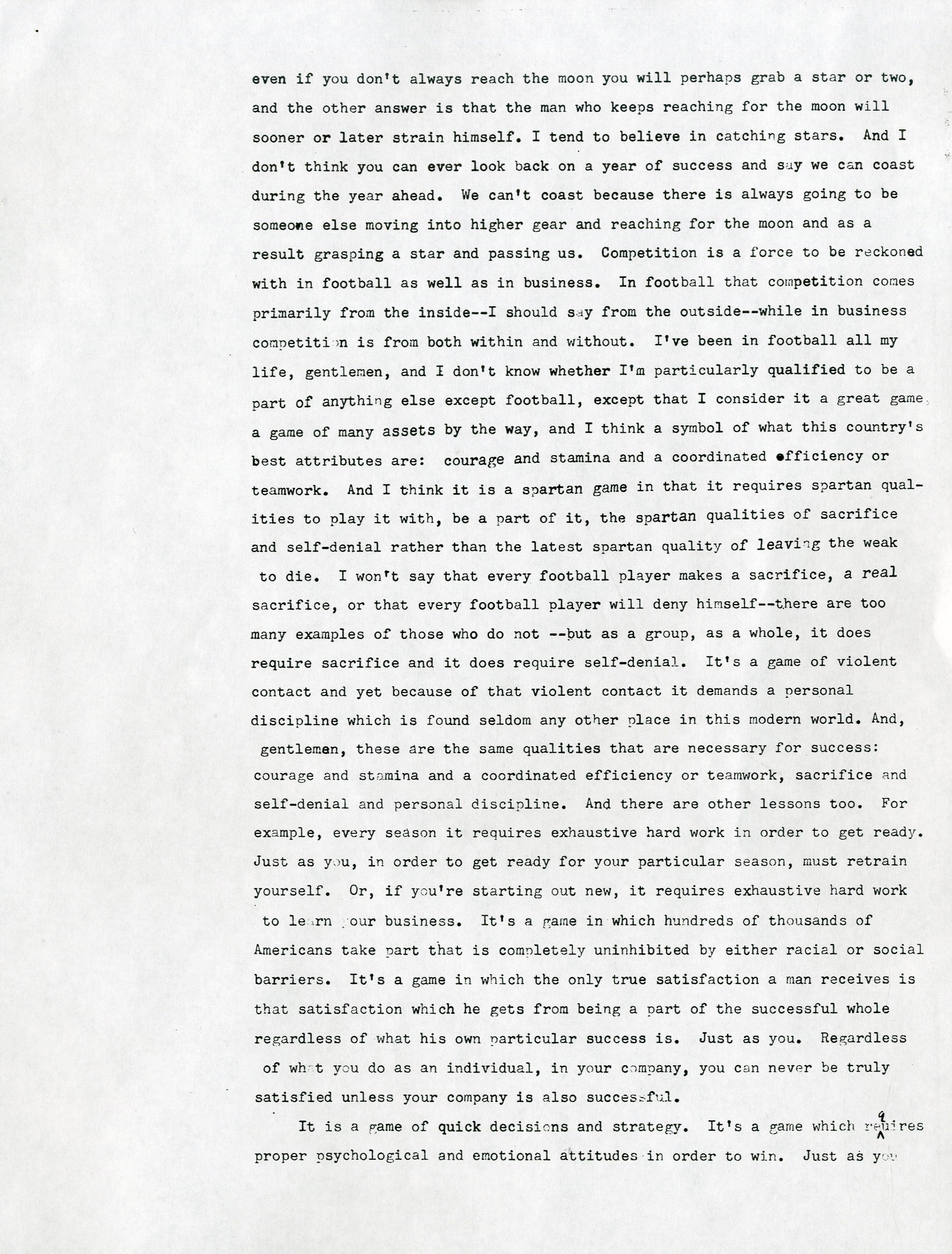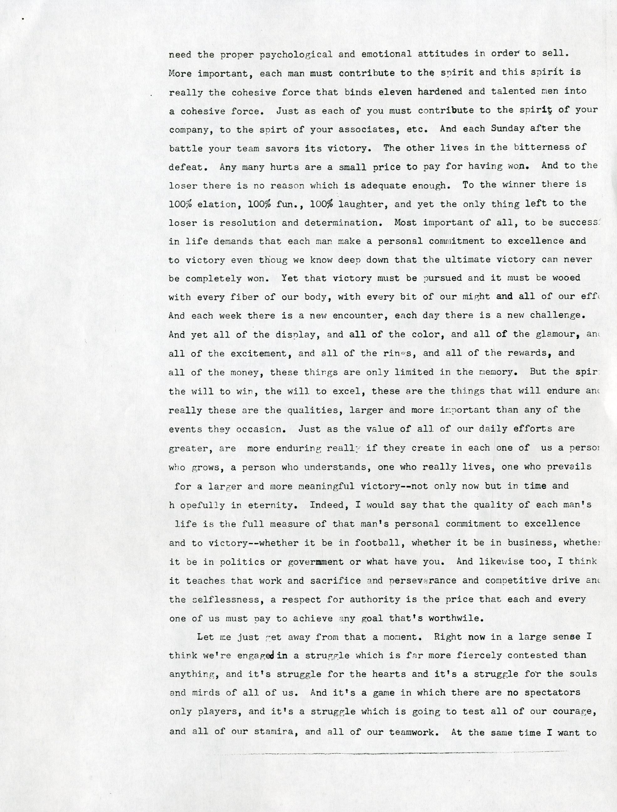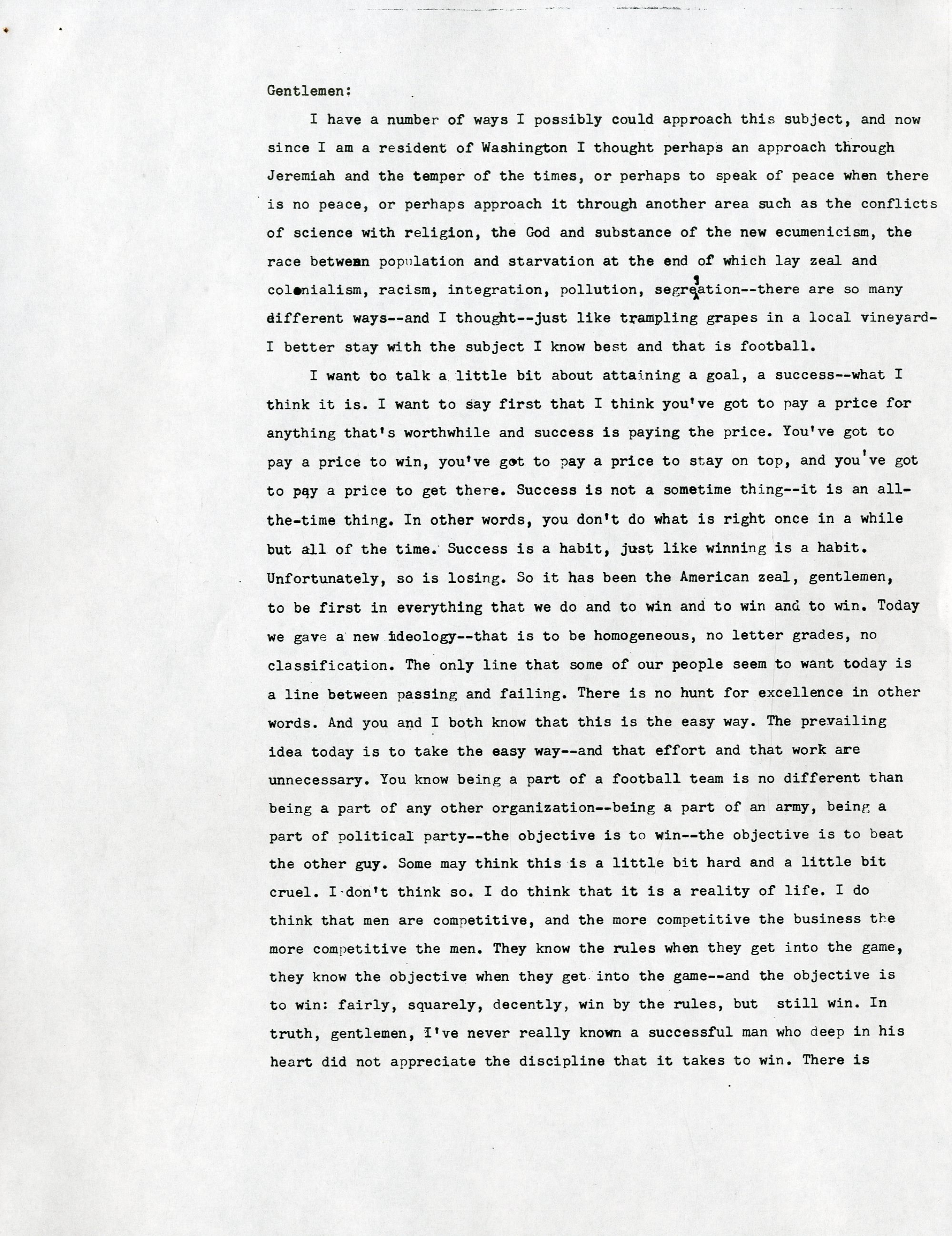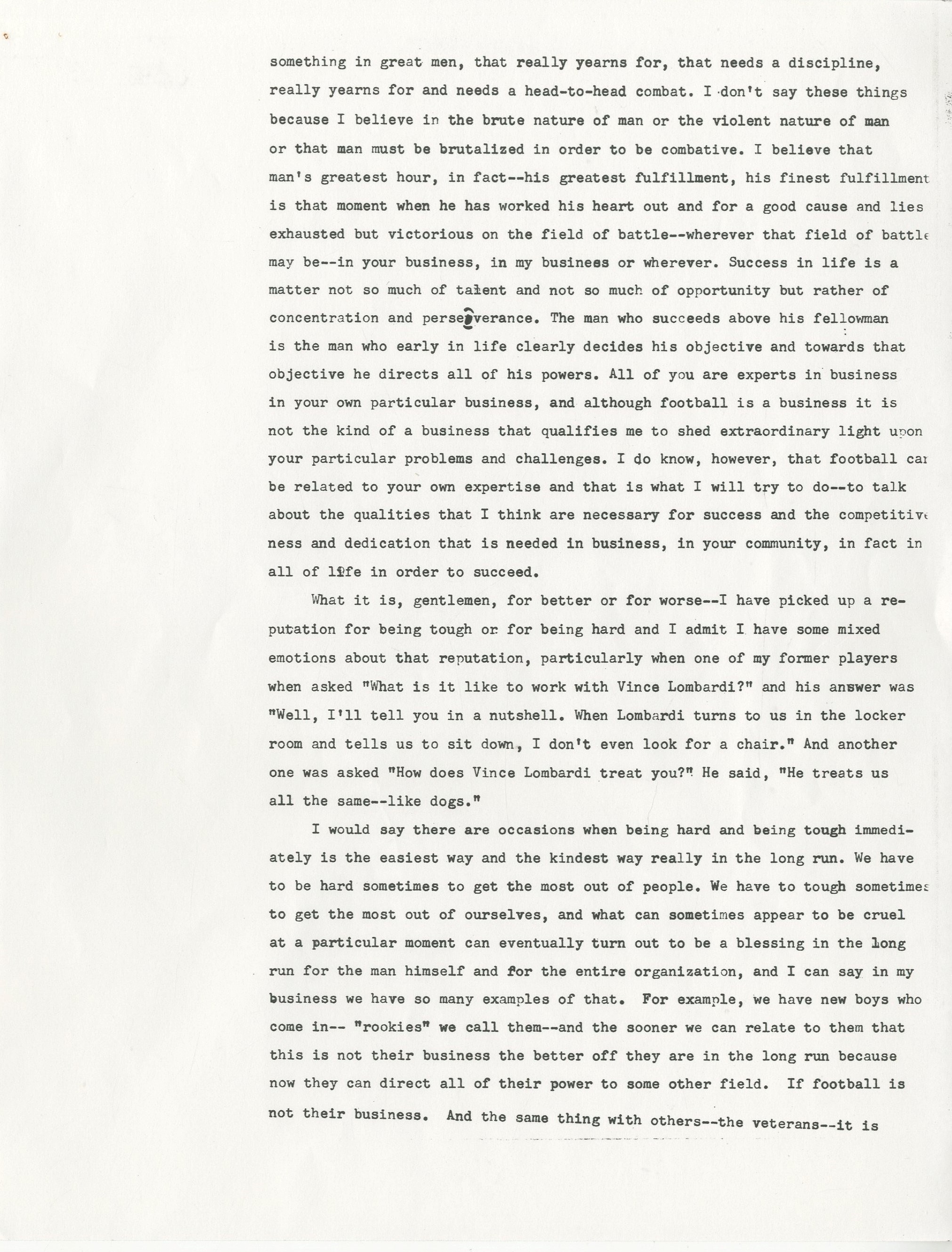 One June 22, 1970, Vince Lombardi gave his final public speech to a business group in Dayton, Ohio. Lombardi was possibly planning for that to be his final public appearance, due to the overwhelming 500+ invitations he received per year, but it was solidified as his final public appearance when he was admitted to Georgetown University Hospital two days later with colon cancer. He remained in the hospital and was operated on three days later in June, then one month later in July. Just over a month after his July operation, he passed on September 3rd. This is THE final speech that Lombardi had on stage with him that day in Dayton, Ohio. It is an incredibly powerful 10-page speech in which Lombardi talks about all aspects of life from football to Groucho Marx. He talks about how football can be related to the business group's expertise and the importance of obtaining success, stating "We have to be hard sometimes to get the most out of people." He later went on to talk about how being tough on rookies was mandatory from the start because he wanted to see whether or not football was the right field for them. To top it all off, he emphasized how he didn't care about criticism, while mentioning Groucho Marx and his ability to let criticism "fall right off his back." This speech says everything about Lombardi's character and gives a clear understanding on how he came to be the most successful and influential coach in football history. There are staple holes on the top left corner of each page, and there are about 20 marks on the speech that Lombardi changed. They are not handwritten, as the speech is a copy of the original, but this is the exact speech that Lombardi read from on that day in Dayton, Ohio.