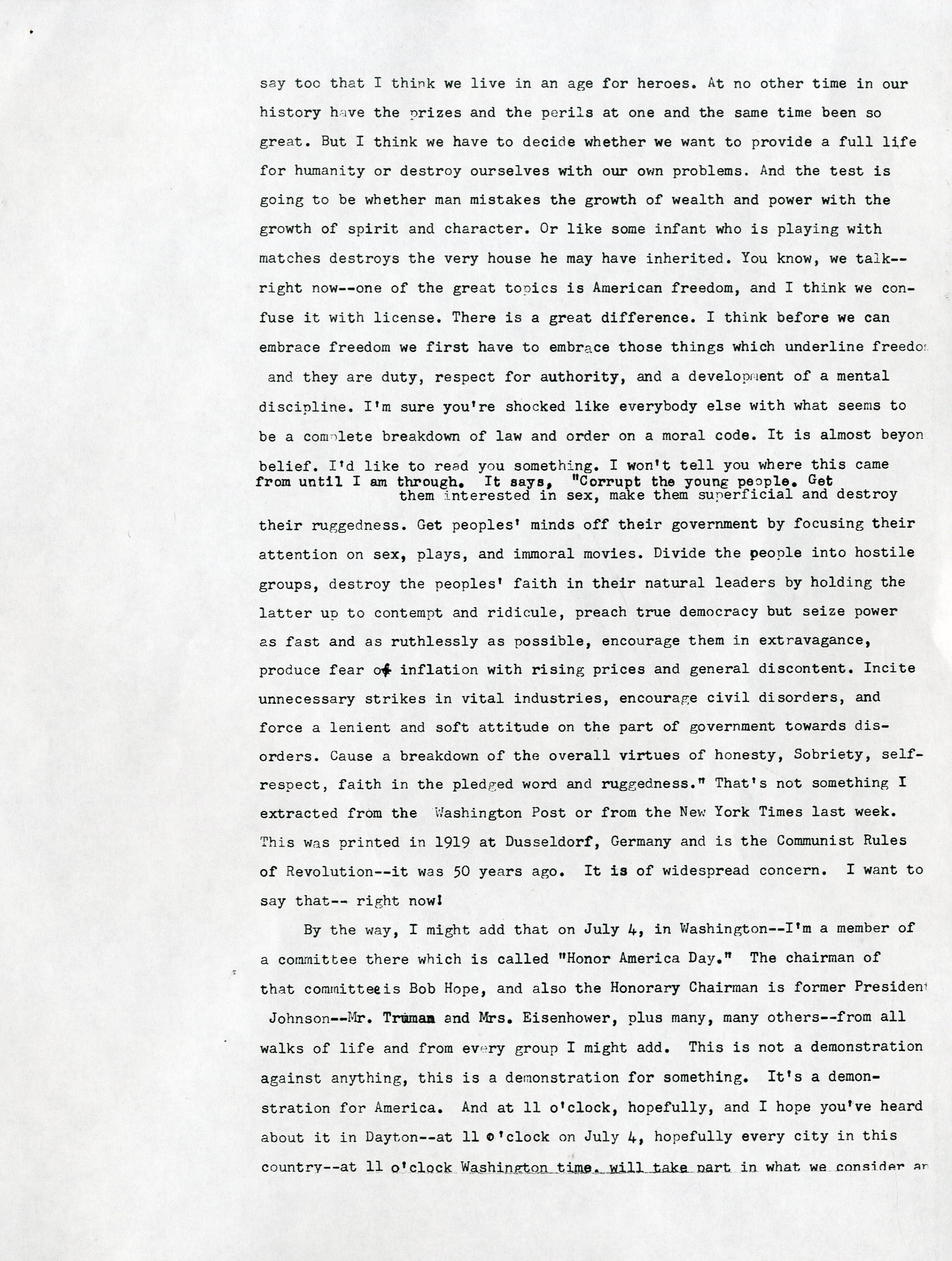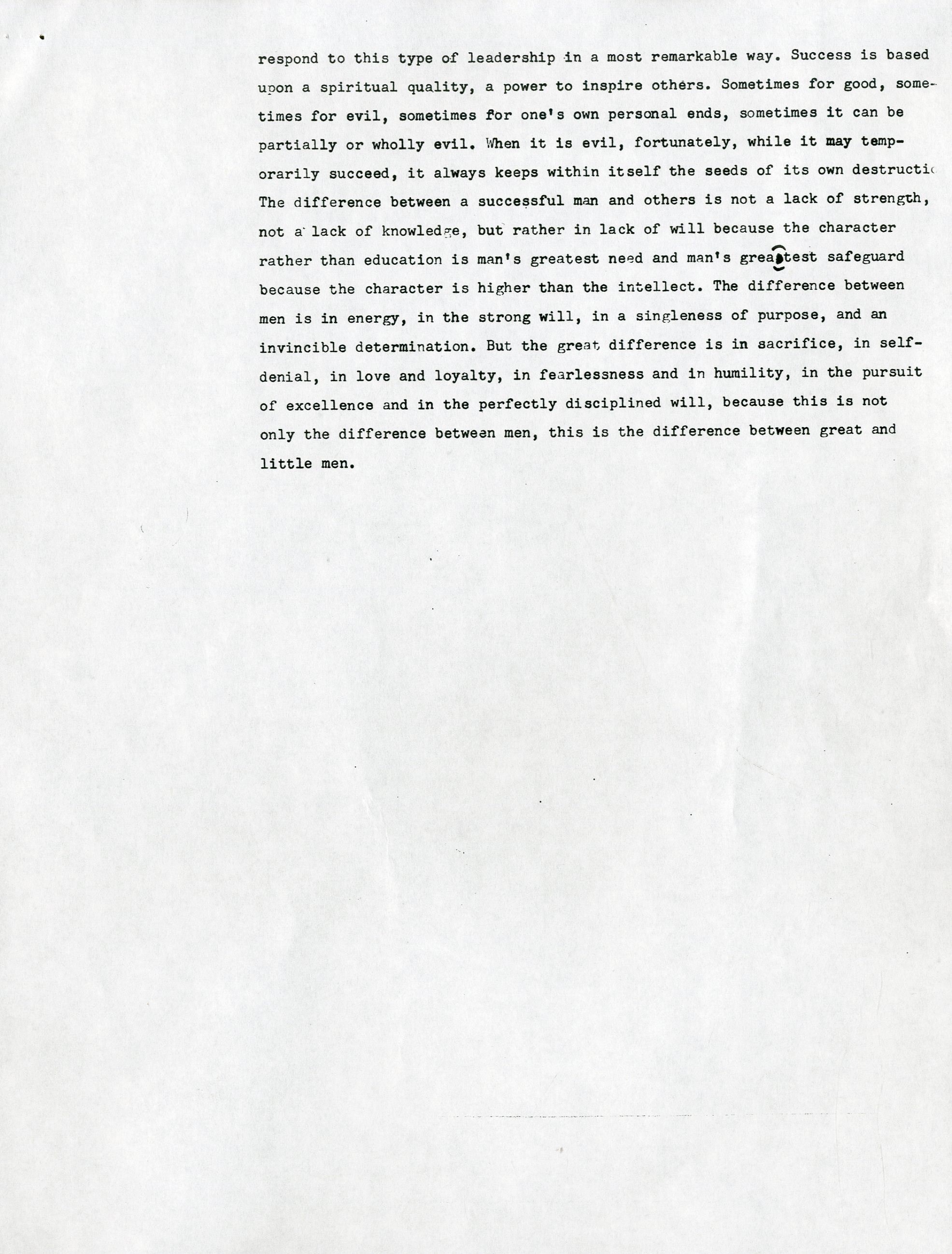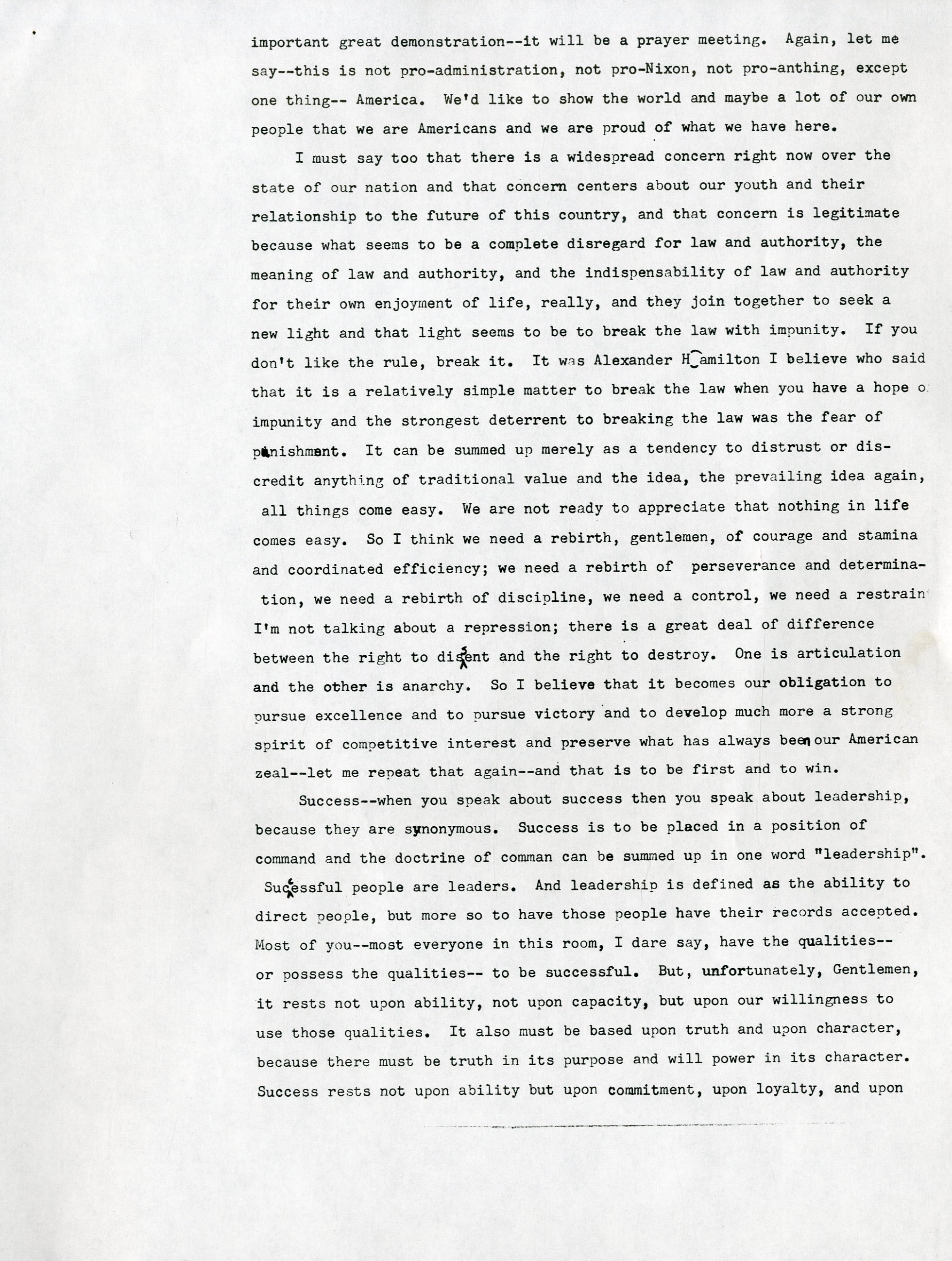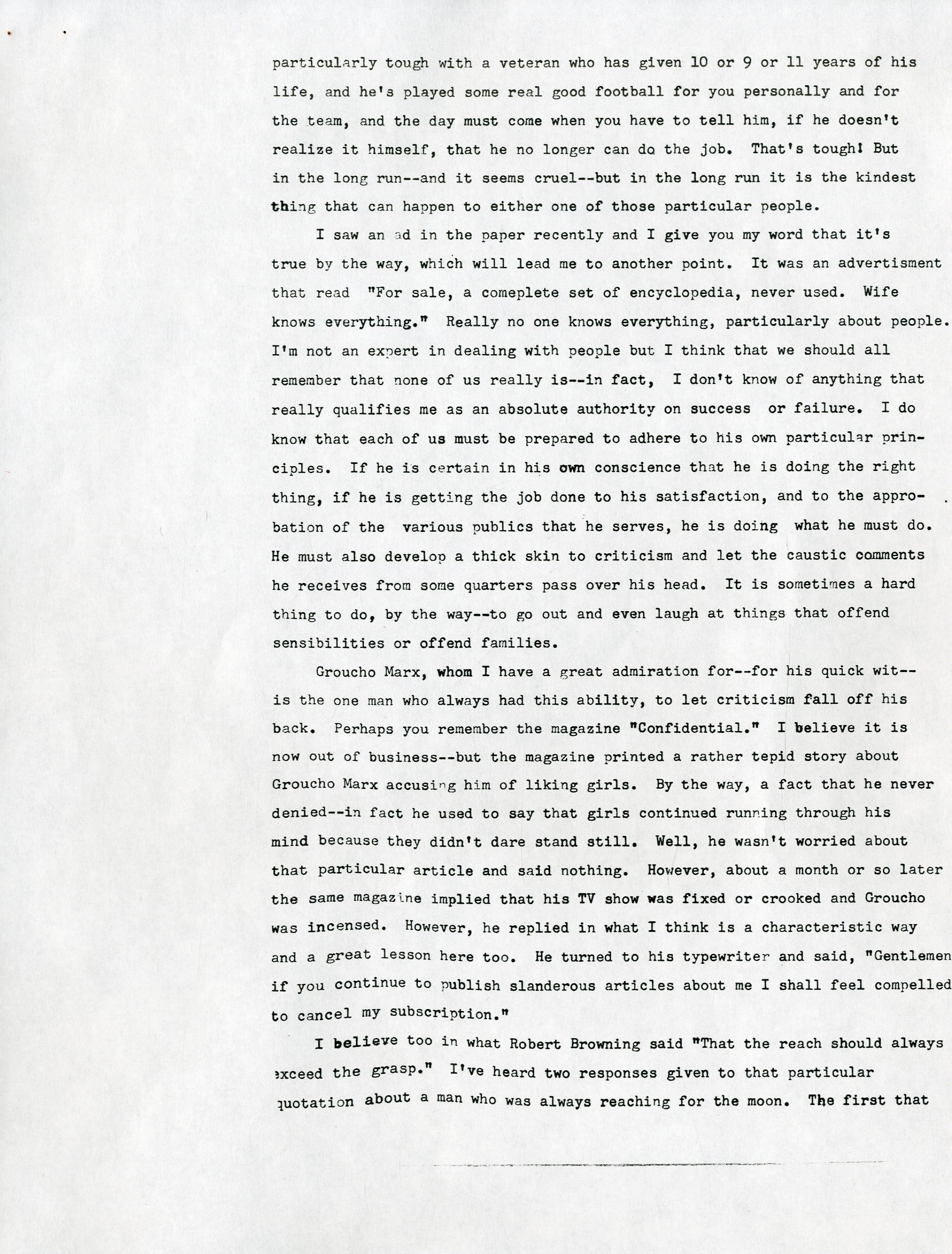 One June 22, 1970, Vince Lombardi gave his final public speech to a business group in Dayton, Ohio. Lombardi was possibly planning for that to be his final public appearance, due to the overwhelming 500+ invitations he received per year, but it was solidified as his final public appearance when he was admitted to Georgetown University Hospital two days later with colon cancer. He remained in the hospital and was operated on three days later in June, then one month later in July. Just over a month after his July operation, he passed on September 3rd. This is THE final speech that Lombardi had on stage with him that day in Dayton, Ohio. It is an incredibly powerful 10-page speech in which Lombardi talks about all aspects of life from football to Groucho Marx. He talks about how football can be related to the business group's expertise and the importance of obtaining success, stating "We have to be hard sometimes to get the most out of people." He later went on to talk about how being tough on rookies was mandatory from the start because he wanted to see whether or not football was the right field for them. To top it all off, he emphasized how he didn't care about criticism, while mentioning Groucho Marx and his ability to let criticism "fall right off his back." This speech says everything about Lombardi's character and gives a clear understanding on how he came to be the most successful and influential coach in football history. There are staple holes on the top left corner of each page, and there are about 20 marks on the speech that Lombardi changed. They are not handwritten, as the speech is a copy of the original, but this is the exact speech that Lombardi read from on that day in Dayton, Ohio.