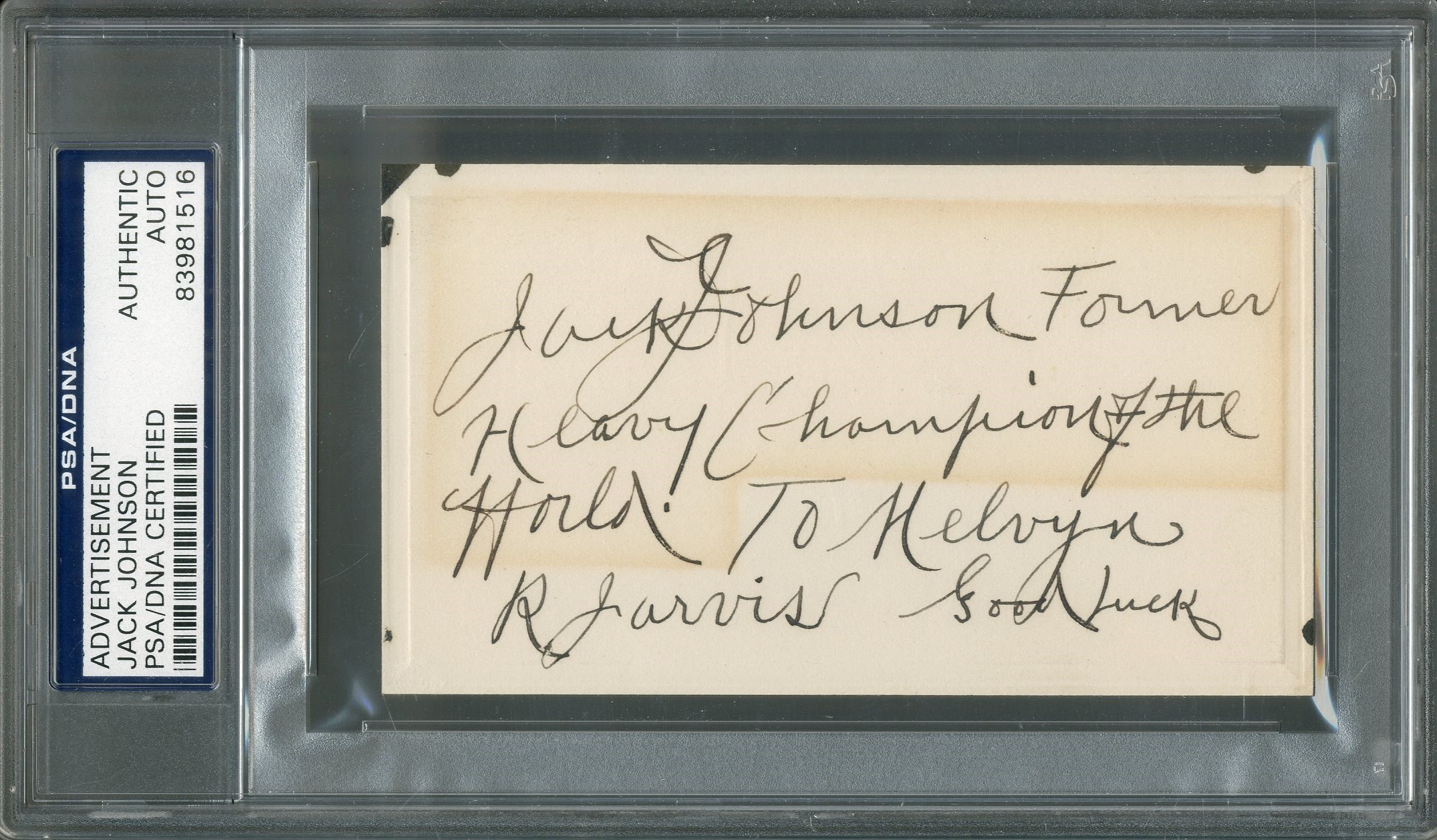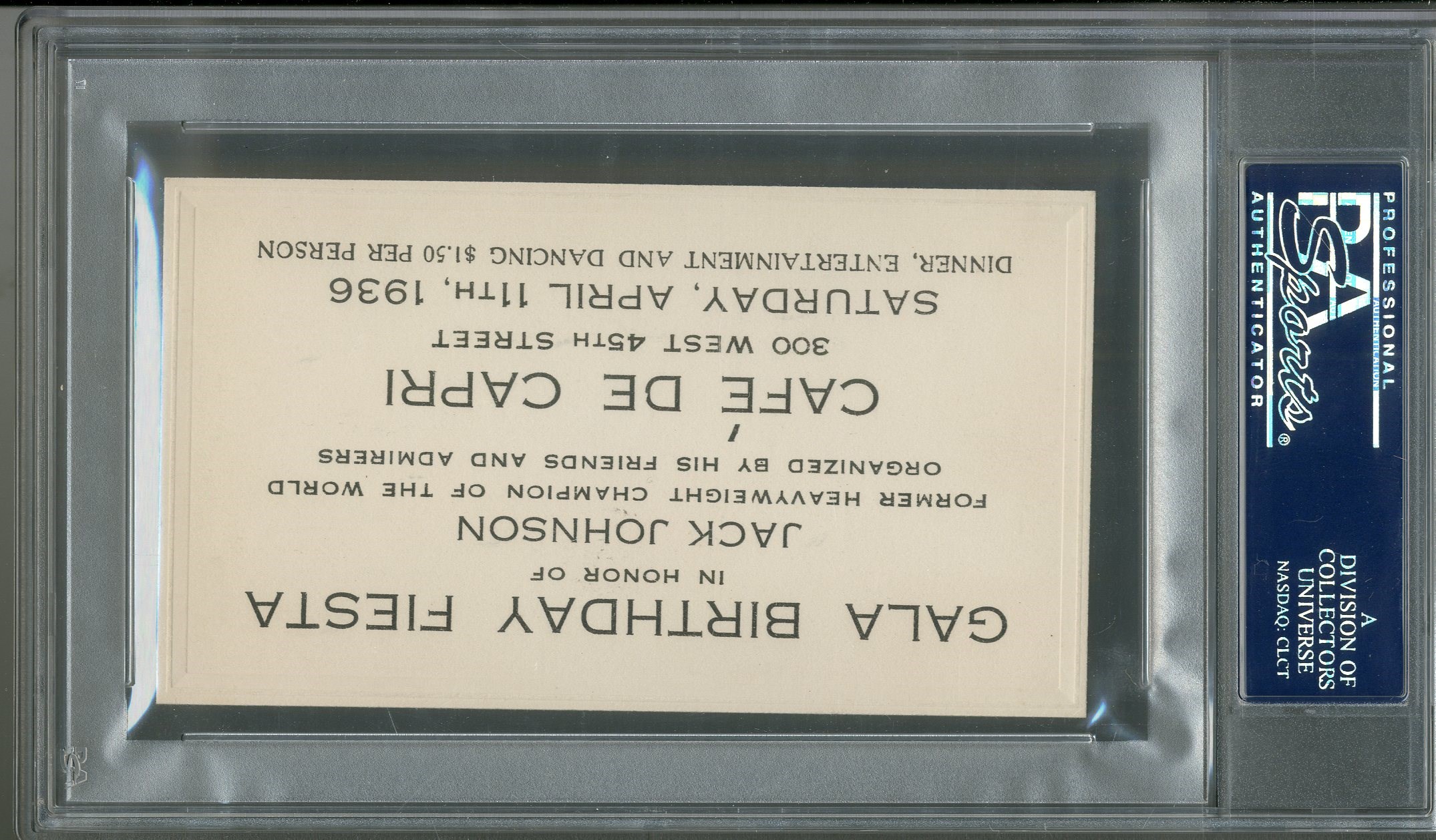 You are looking at an incredible signed birthday invitation to Jack Johnson's 58th "Gala Birthday Fiesta" that took place at the Cafe de Capri in New York City on April 11th, 1936. Signed on the back by Johnson in 9.5/10 ink and he additionally wrote "Former Heavy Champion of the World, To Melvyn R Jarvis, Good Luck". The card itself is of a moderately heavy stock, not paper thin and measures 2.5x4.5". It appears that the signature was originally displayed with the inscription covered, hence the slight toning. Has been authenticated and encapsulated by PSA.