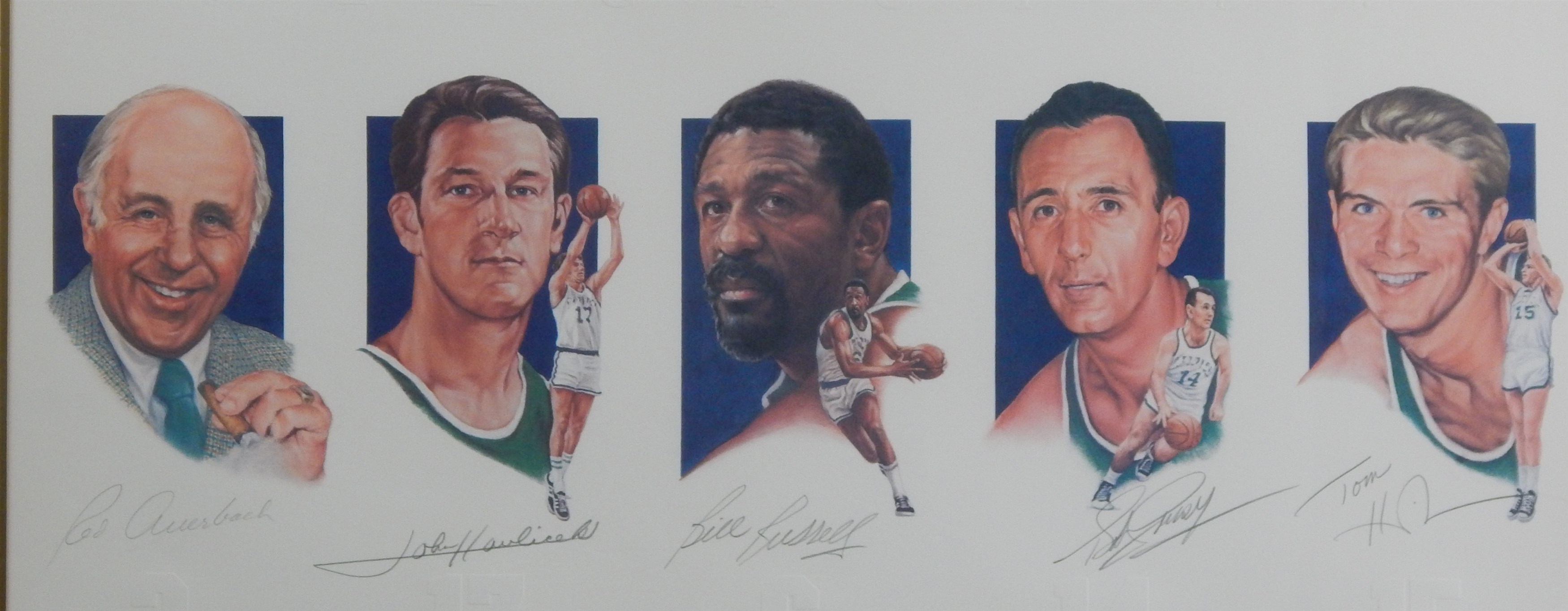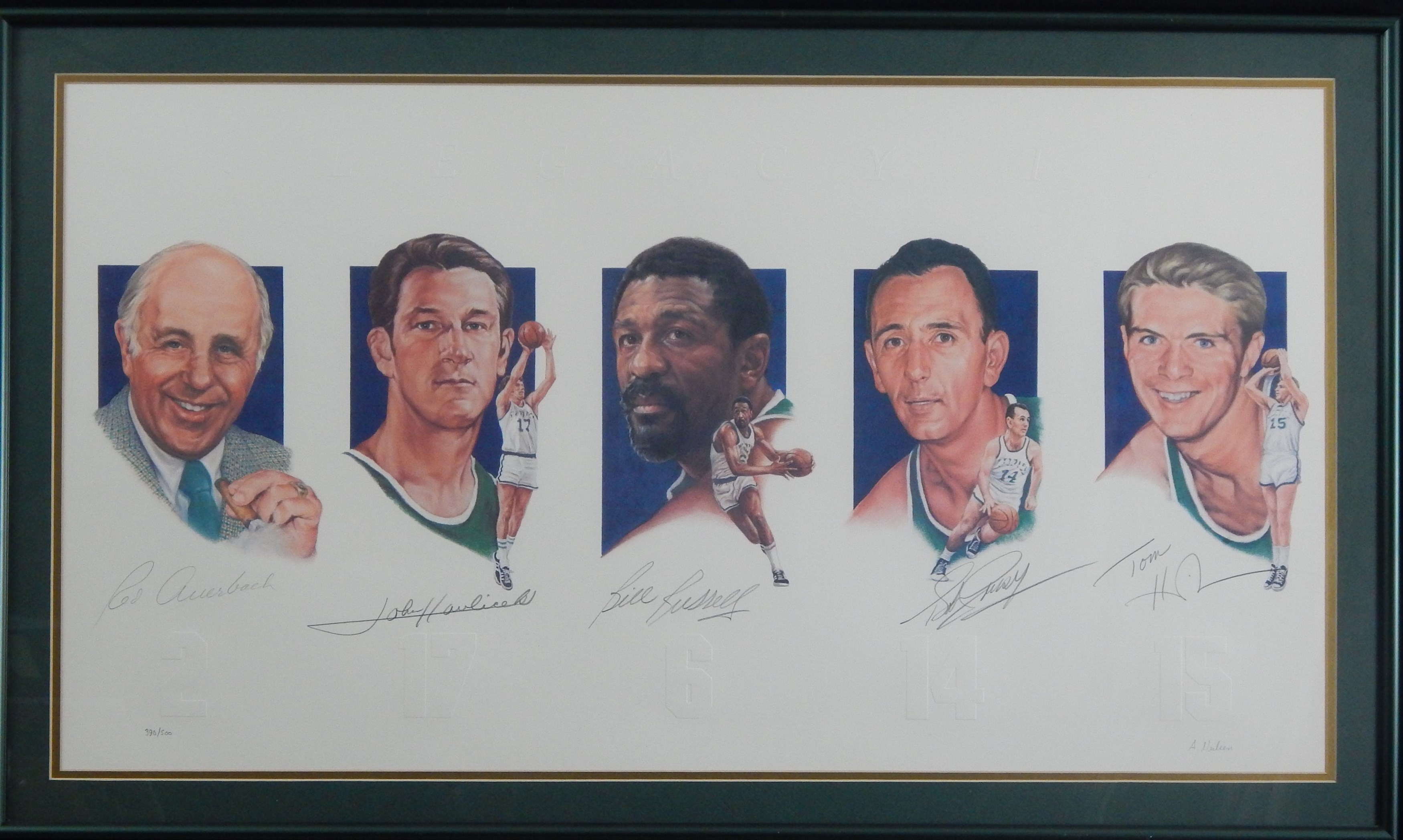Titled "Legends" in embossed letters this Boston Celtics signed print features coach Red Auerbach and players Havlicek, Russell,Cousy and Heinsohn. Each signed under their picture and above their embossed retired number. This is a limited edition print 390/500. Artist Anne Neilson also signed the print. The piece measures 40x24" framed.