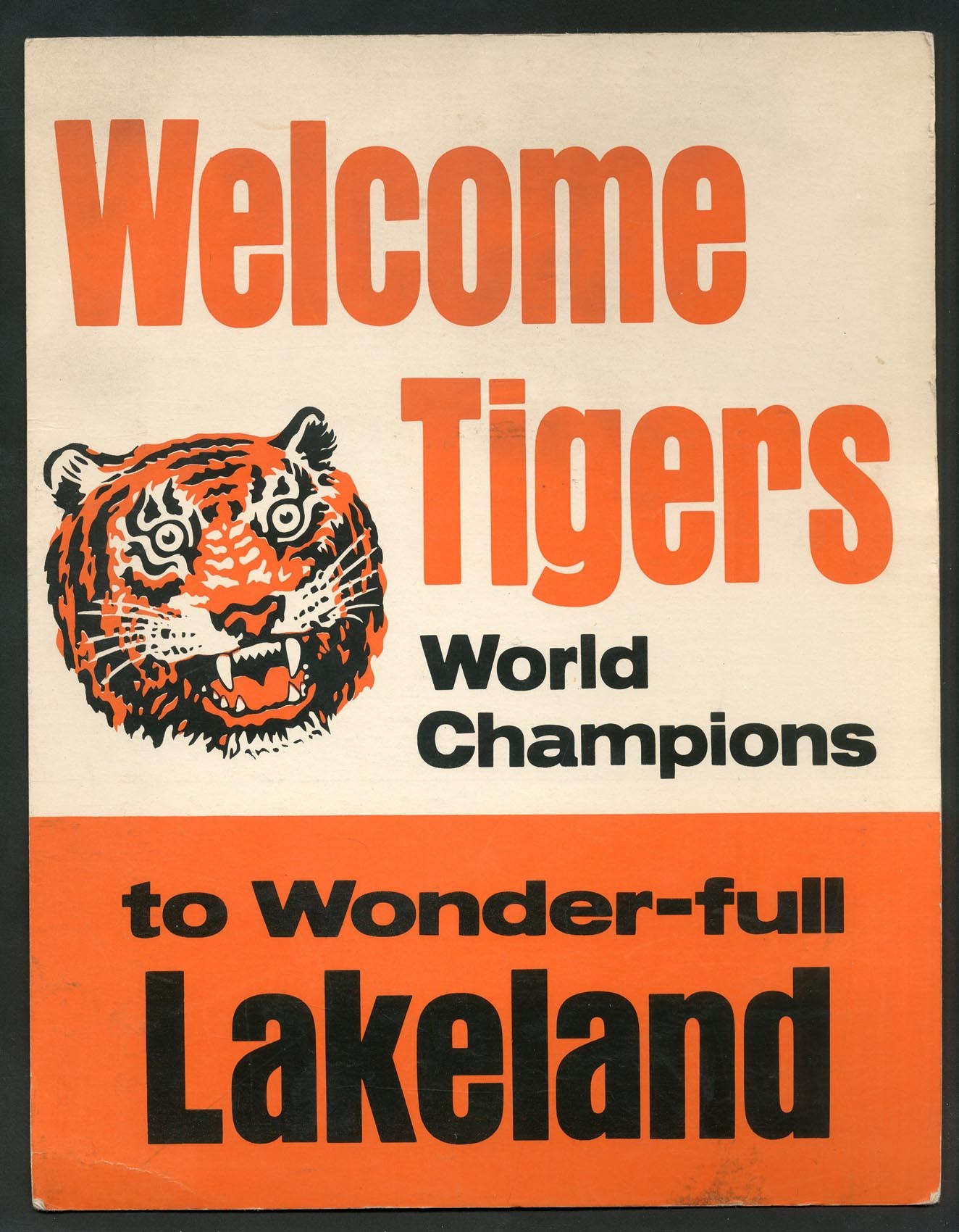 The Detroit Tigers won the 1968 World Series over the St. Louis Cardinals in 7 games, and when they arrived back in Florida for Spring Training in 1969, this welcome sign was in Lakeland, their spring training home since 1934 (except for the World War II years of 43-45). In Tiger orange and black, with off-white, the poster (10.5x13.5") features a snarling tiger and the words, "Welcome Tigers, World Champions, to Wonder-Full Lakeland". Poster has some slight discoloration in small areas and some wrinkling at corners, but in overall good condition. Nice remembrance recalling those champs like Denny McLain, Willie Horton, Al Kaline, Mickey Stanley et al.