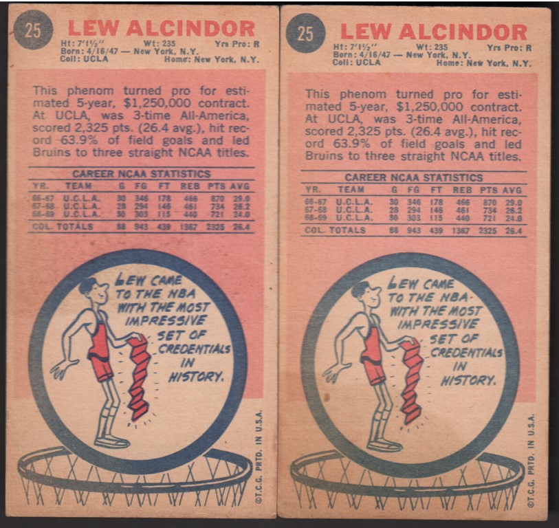 Topps 1969-70 #25 Rookie Lew Alcindor card. Now known as Kareem Abdul Jabbar, he is the all-time NBA scorer leader with 38,387 points, a record six MVP awards, and six NBA Championships. Overall VG-EX.
