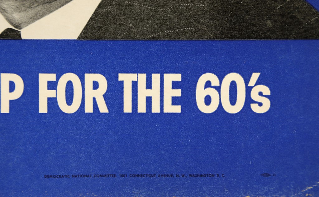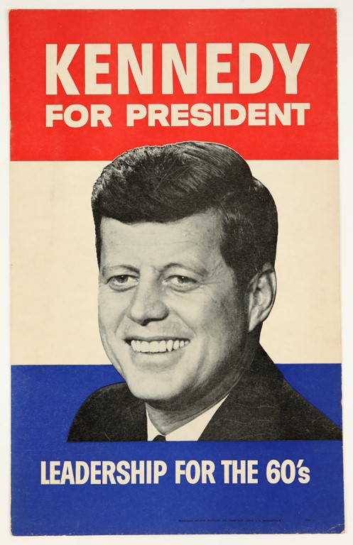 A spectacular John F. Kennedy 1960 campaign poster. This vivid red, white, blue, and black illustrated piece measures 14x22". The poster has vivid colors and is in VG condition with a few creases and some corner wear.