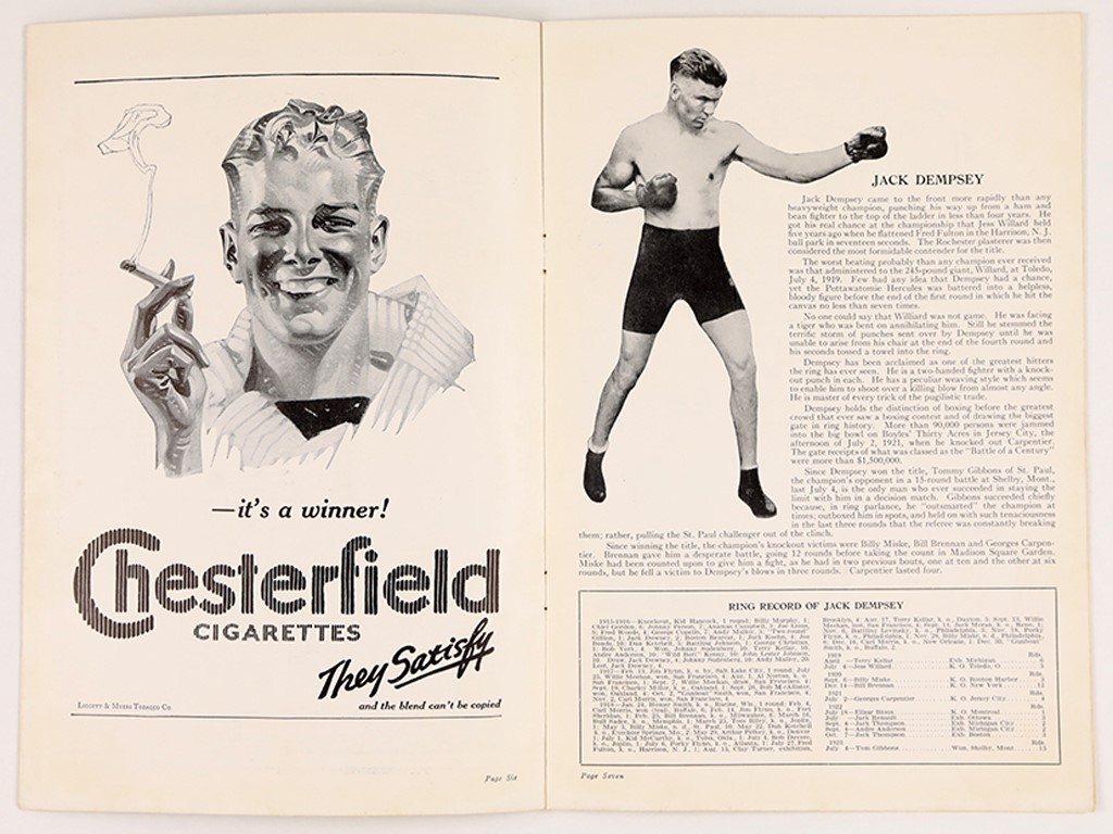 One of the key programs from boxing’s Golden Age. Jack Dempsey, the Manassa Mauler, reigned supreme as the face of the sport in the 1920s, considered to the best of all pugilists. The fight was certainly one of the most exciting and discussed events in the history of boxing. The slugfest between Dempsey and Luis Firpo was absolute mayhem for three minutes and 57 seconds before Dempsey won by KO in the second round. Firpo dropped Dempsey with his first punch, but Dempsey came back to knock down Firpo seven times before the end of the round. Before the sound of that first bell, Firpo knocked Dempsey clear through the ropes and onto a sportswriter’s typewriter. Cover displays photos of both pugilists in gentleman’s clothes. Program is unscored and has EX appearance overall; minor restoration on spine noticed.