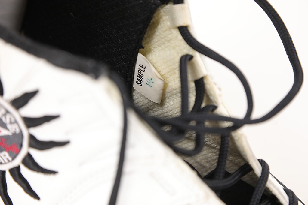 1997-98 Dennis Rodman game worn sneakers attributed to 11/5/97. White Converse All-Star React size 14 sneakers show slight wear and feature Rodman's number "91" on back of each shoe. Sample tag with handwritten "14" inside. Shoes source from the same Dennis Rodman collector who has consigned other fine examples with Lelands in past auctions.