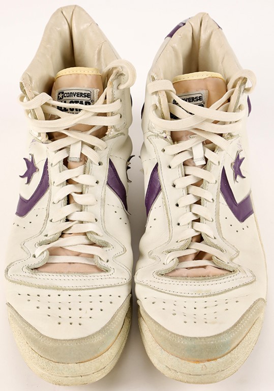 Mid-1980s Magic Johnson game worn Converse sneakers source from the family of a former Knicks employee who obtained these shoes in the locker room after a game which he worked. Each shoes has "Magic" printed on the outside beneath the Converse star in block letters. Magic wore this style shoe for a number of years in the 1980s, including the 1984 & 1985 NBA Finals, and we have shown a few photographs of Magic wearing this style. We found numerous photos online in which the creases seem to line up to the creases of our shoes, but just not definitive enough to photo-match. Both shoes have heavy wear with creases in the right spots as well as a few scuffs and loose threads. Size 14 1/2 "Made in USA tags" are found in each.