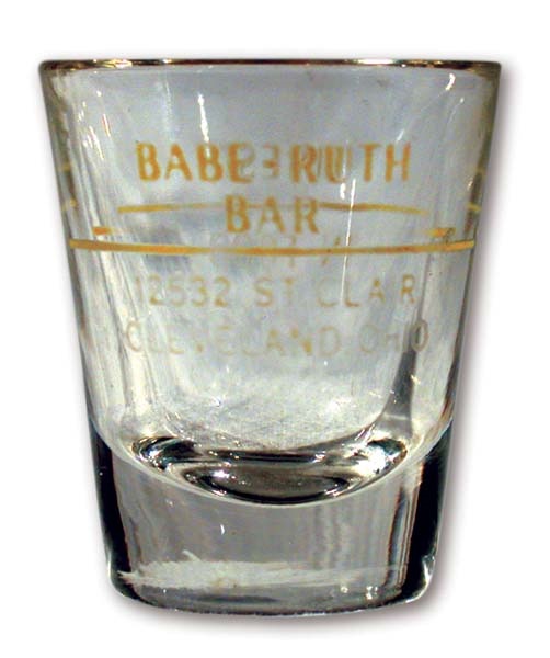 His name sold everything else, why not booze as well? Vintage shot glass was lifted from a Cleveland, OH bar named for the slugger who confounded the Indians with his unbeatable Yanks. EX+.