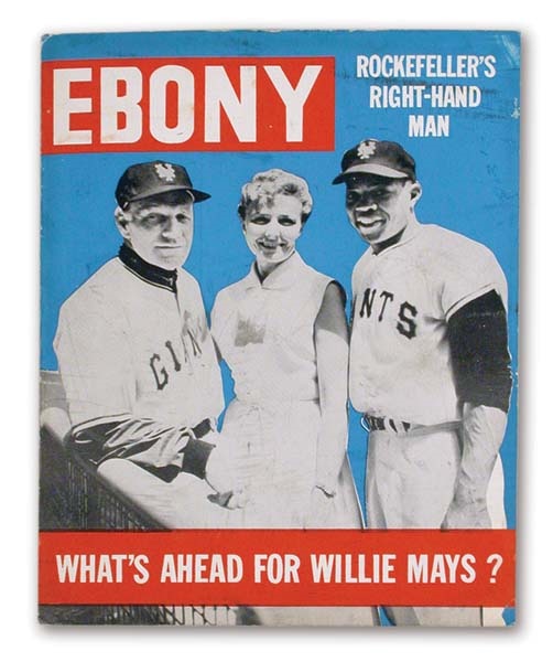 The first one of its kind ever seen. Silk-screened sign is cardboard and essentially handpainted. Awesome image of Willie with Leo Durocher and his wife actress Lorraine Day. Blaring sign at bottom trumpets, "What's Ahead for Willie Mays?" Andy Warhol-look with day glo blue background and brilliant reds to make it all "pop" out. Measures 13.5x10.25" and is overall a very strong VG-EX. This was to advertise an upcoming issue/cover that was never released.