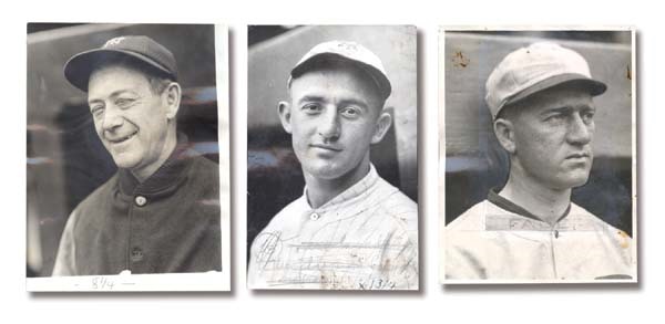 Miller Huggins, the diminutive manager of Babe Ruth’s Murderer’s Row smiles for the camera of the game’s most famous shutterbug (6.5x9”).  Frisch (5x8”) and Faber (7x8”) round out this HOF collection.  They’re immediately recognizable as Conlan’s work, but in case you don’t believe it, his stamp is on verso of all.  VG-EX average.