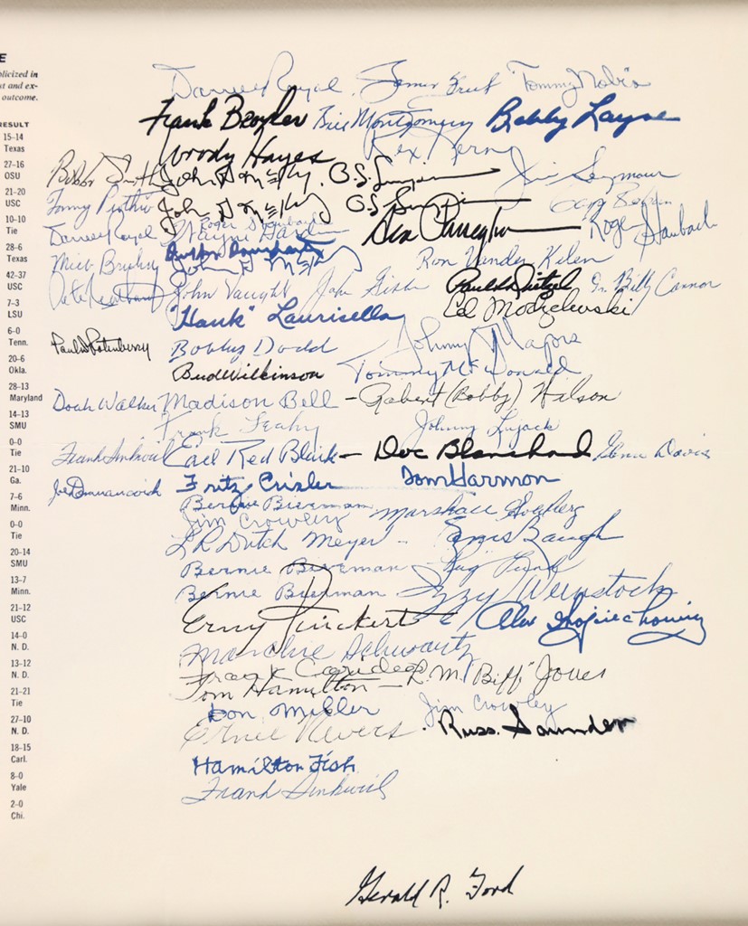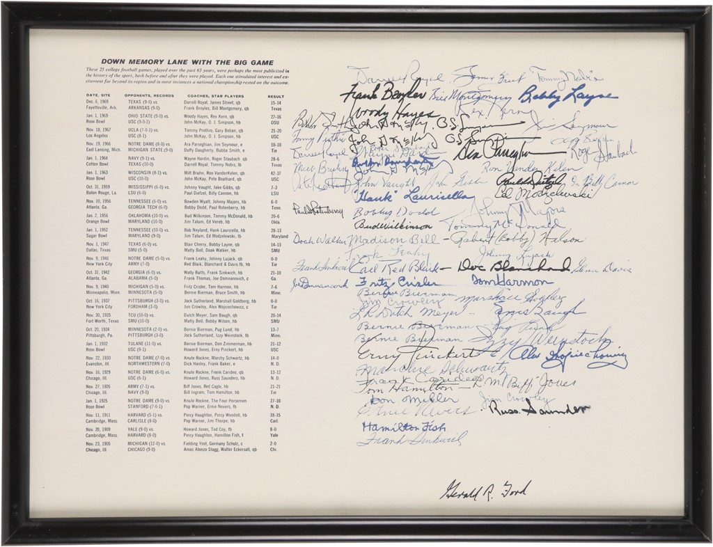 Multi-signed program circa 1975 from the collection of Heisman winner Glenn Davis. Signed by over 70 college football legends including multiple Heisman winners, in addition to President Gerald Ford on the bottom. Featured are: Woody Hayes, Jim Crowley x2 (Four Horsemen), Don Miller (Four Horsemen), Roger Staubach x2, Ernie Nevers, OJ Simpson, Bud Wilkinson, Billy Cannon, Doak Walker, Fitz Crisler, Bobby Layne, Johnny Lujack, Doc Blanchard Glenn Davis, Dutch Meyer, and more. Nicely framed to 17x13", the program is quad-folded with printed list of the top 25 most publicized college football games of the previous 65 years. President Ford's signature stands alone at the bottom in crisp black marker.