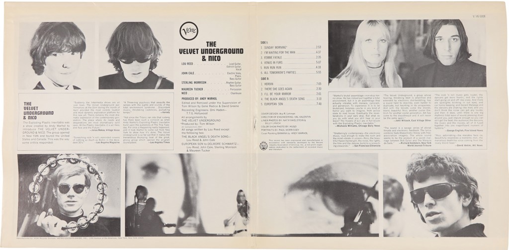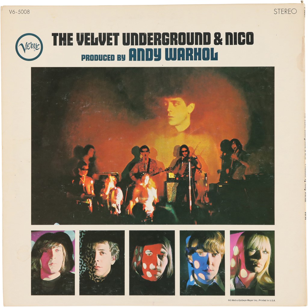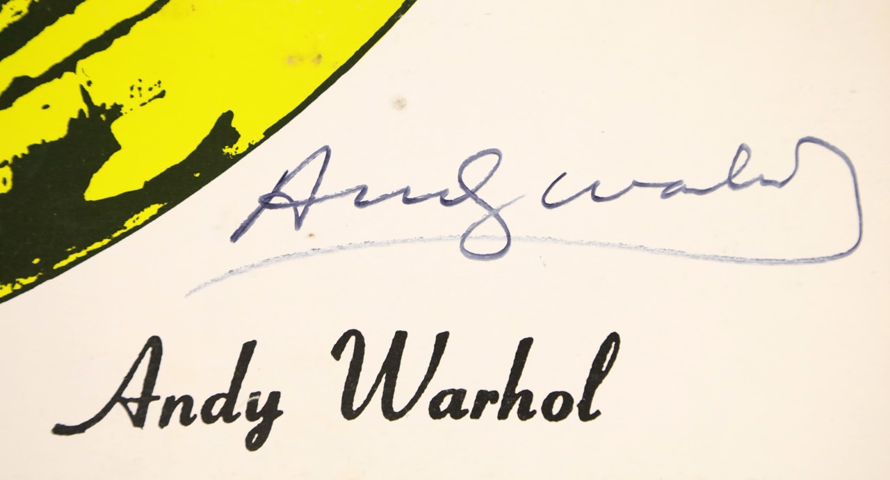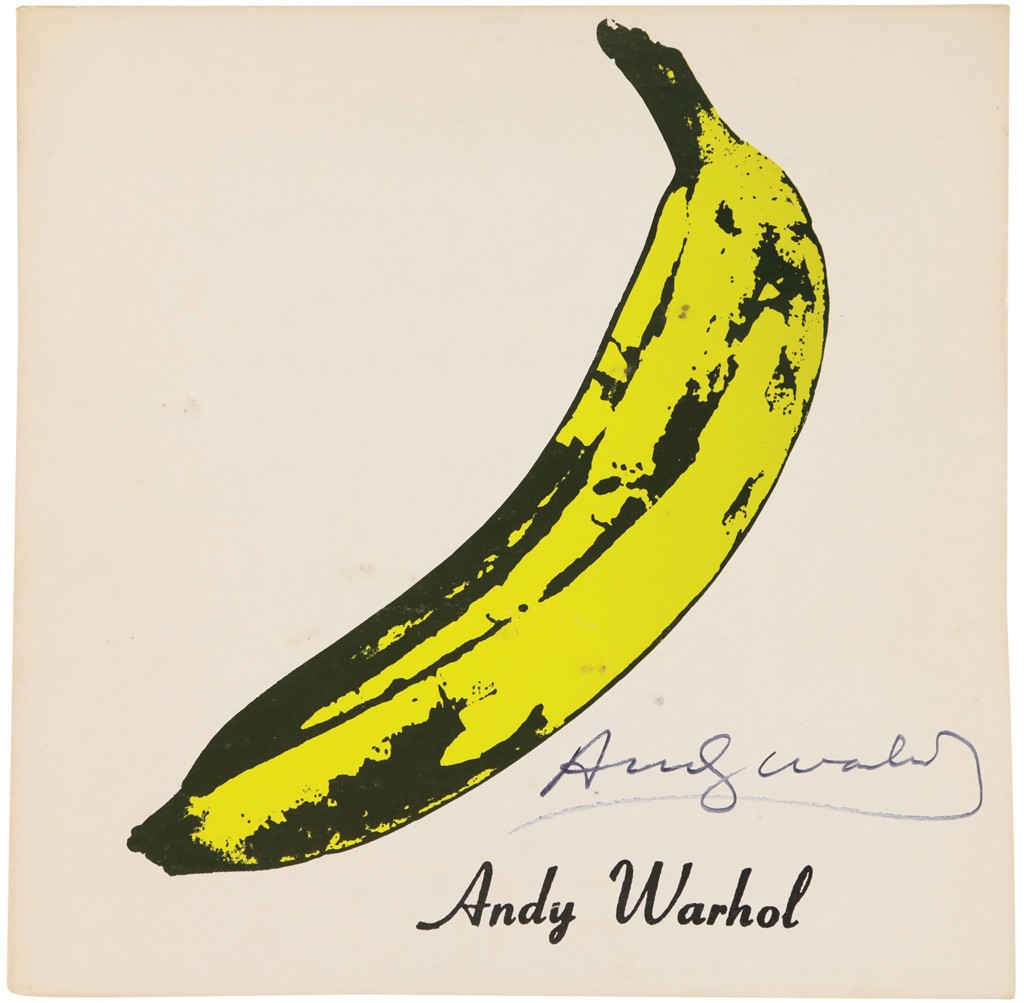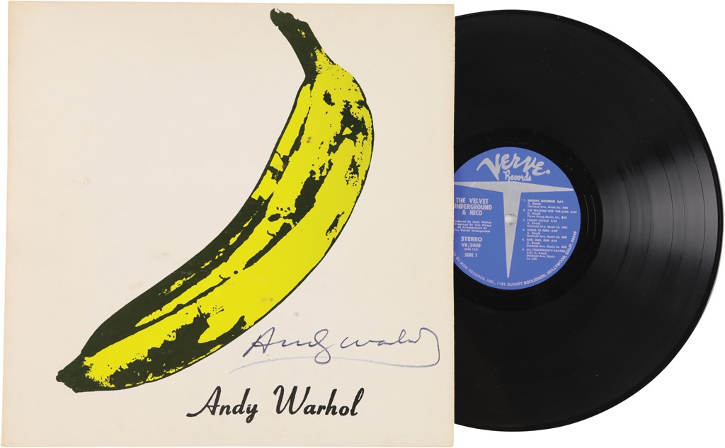 Andy Warhol signed 1967 Banana album performed by The Velvet Underground & Nico and produced by Warhol. Signed on front in black marker by the legendary artist, great liner notes in the foldout cover heralding the band and its producer. There is what appears to be some water damage to the right edge, but the included record appears unaffected with no visible scratches. Though it initially sold poorly, its controversial themes and content led to it being considered one of the most influential albums in popular music.