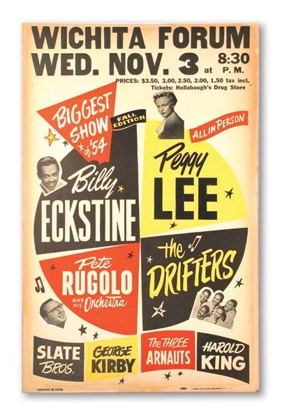14x22". “The Biggest Show of 1954" at the Wichita Forum in Kansas is a boxing style cardboard concert poster featuring Billy Eckstine, Peggy Lee, and introducing the Drifters, still with founding member, Clyde McPhatter, who left a year later. An incredible rarity in magnificent NRMT.