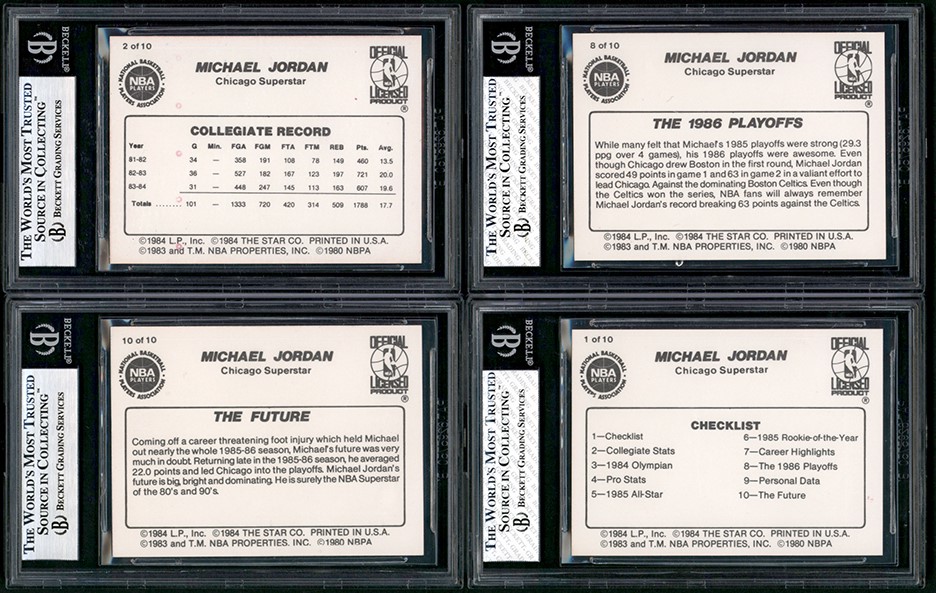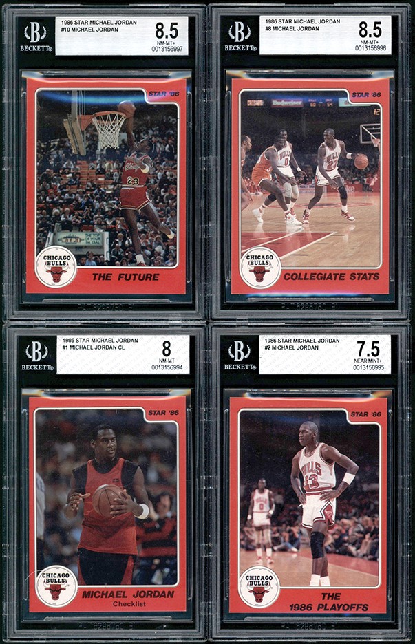 Collection of (4) 1986 Star Co. Michael Jordan cards all graded and encapsulated by BGS. The collection includes one each of: #1 BGS NM-MT 8; #2 NM+ 7.5; #8 NM-MT+ 8.5; #10 NM-MT+ 8.5.