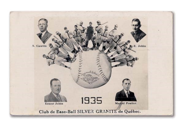 The “Club de Base-Ball, Silver Granite de Quebec” is pictured standing atop the baseball earth, with the team executives posted at the four corners. On back is an International League scorecard for a game between the Mohawk Giants and the Silver Granite. A couple ink markings on verso, otherwise clean. EX.