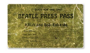 The return visit to the Hollywood Bowl was once again promoted by KRLA disc jockey Bob Eubanks, who later went on to fame as the host of TV's "The Newlywed Game." Distribution of these gold and embossed oversized press passes was extremely limited. Such credentials rarely appear. Moderate creasing. 5 1/4"x2 3/4".