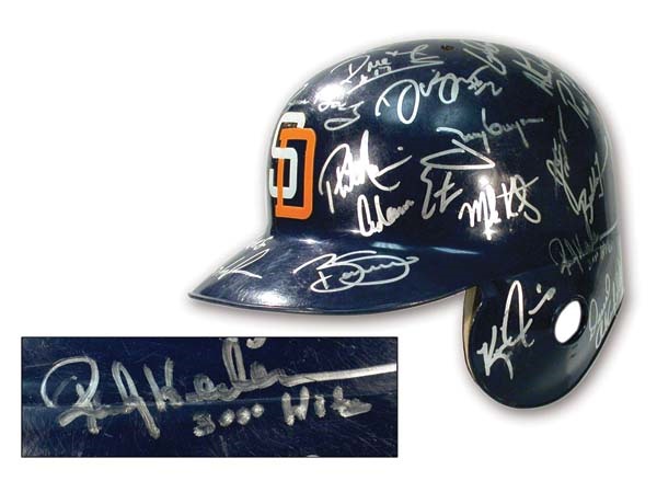 What was going through the future Hall of Famer's head when he cracked hit number 3,000? Well, we can't be sure, but we do know what was protecting it--this San Diego Padres batting helmet! Battle-scarred headgear was worn by Henderson as he joined that famous and exclusive club, further ensuring his immortality in baseball lore. "Diamond Collection, American Baseball Cap [size] 7 1/4" stickers inside, with "7 1/4, '99" scratched under the visor. Number "24" sticker on back. Following the feat, Henderson had all of his teammates sign the helmet in silver sharpie (note fellow Club member Tony Gwynn). Of course, Henderson's signature is here too. Acquired directly from Rickey, with his LOA.