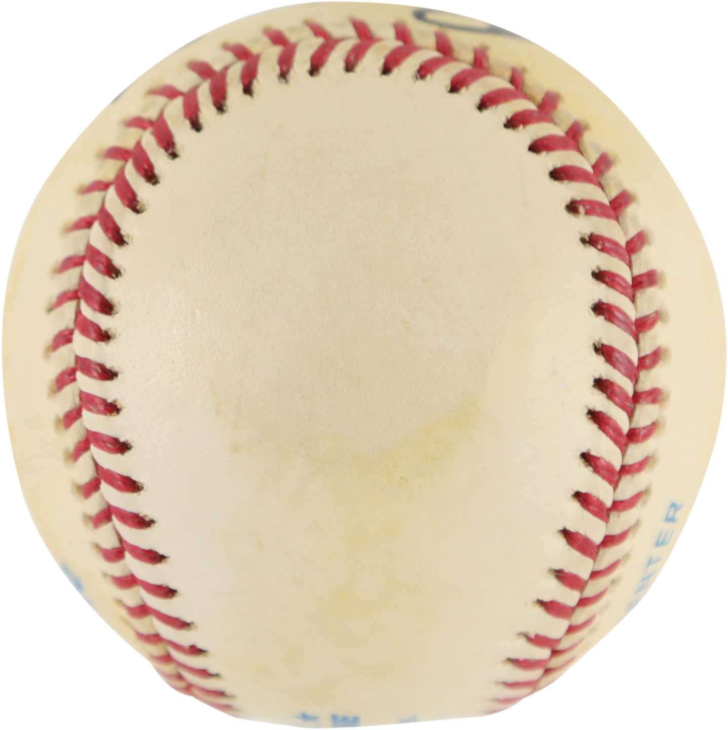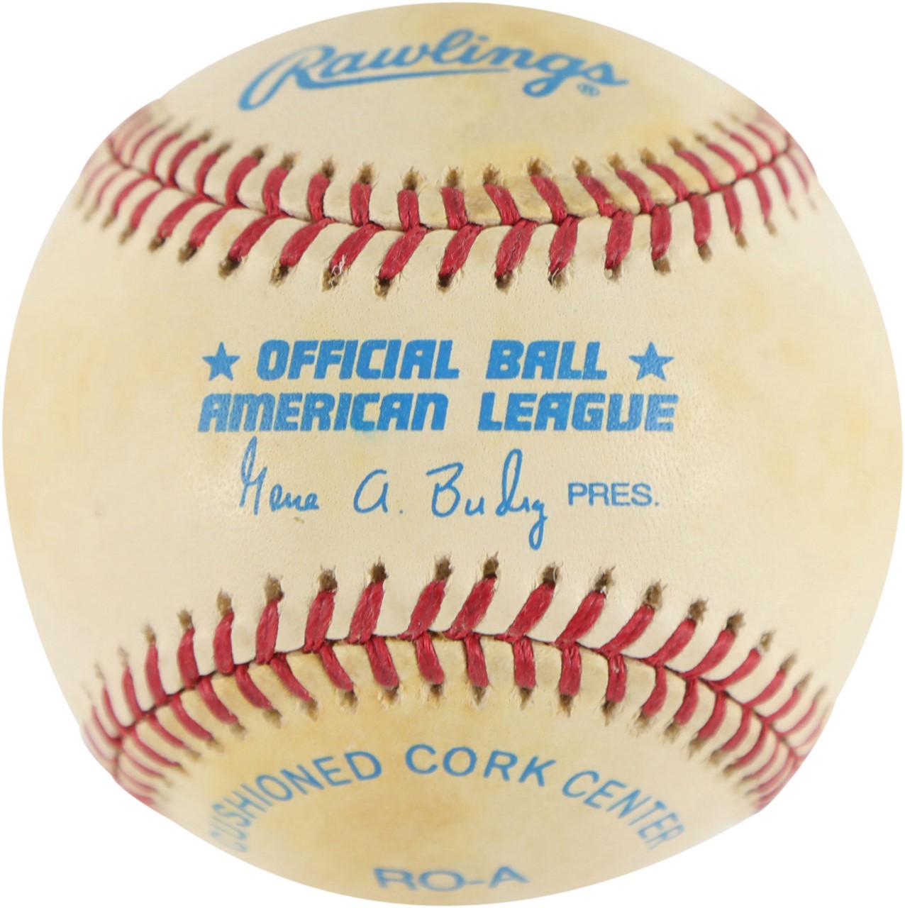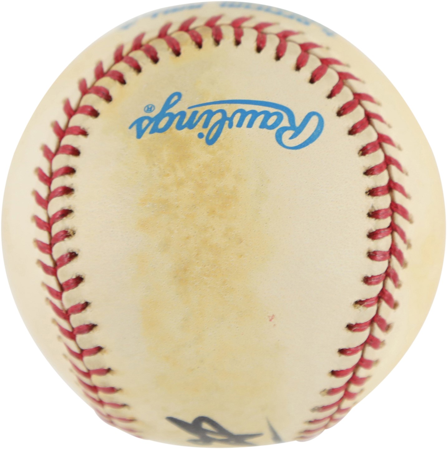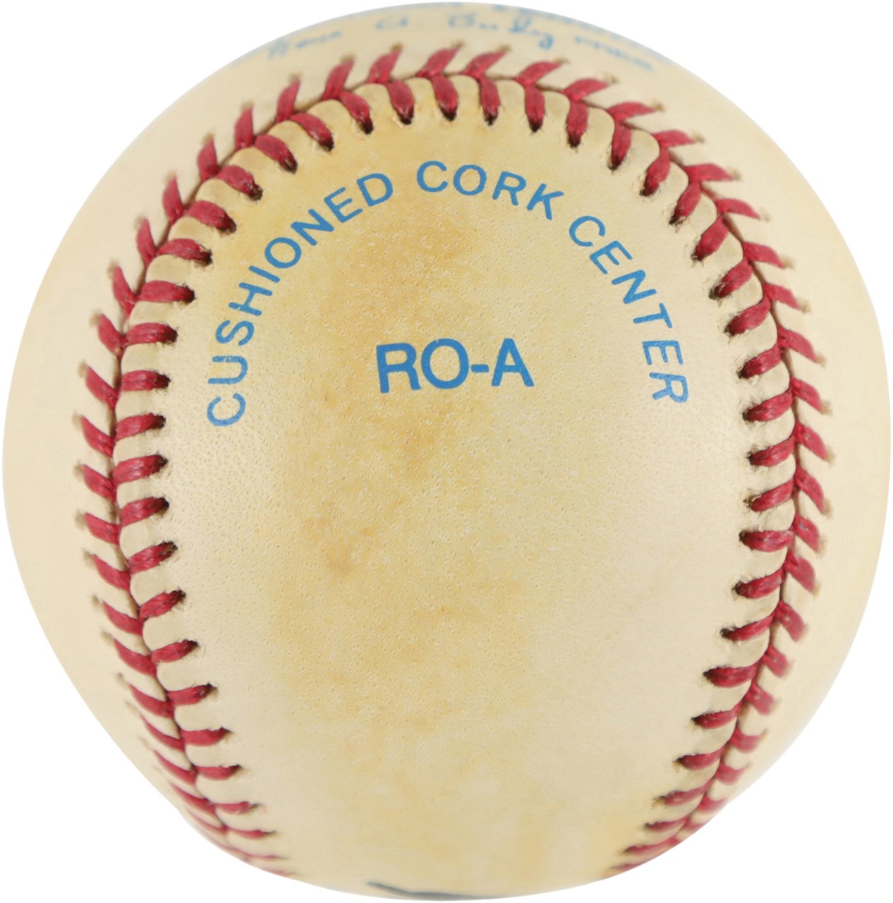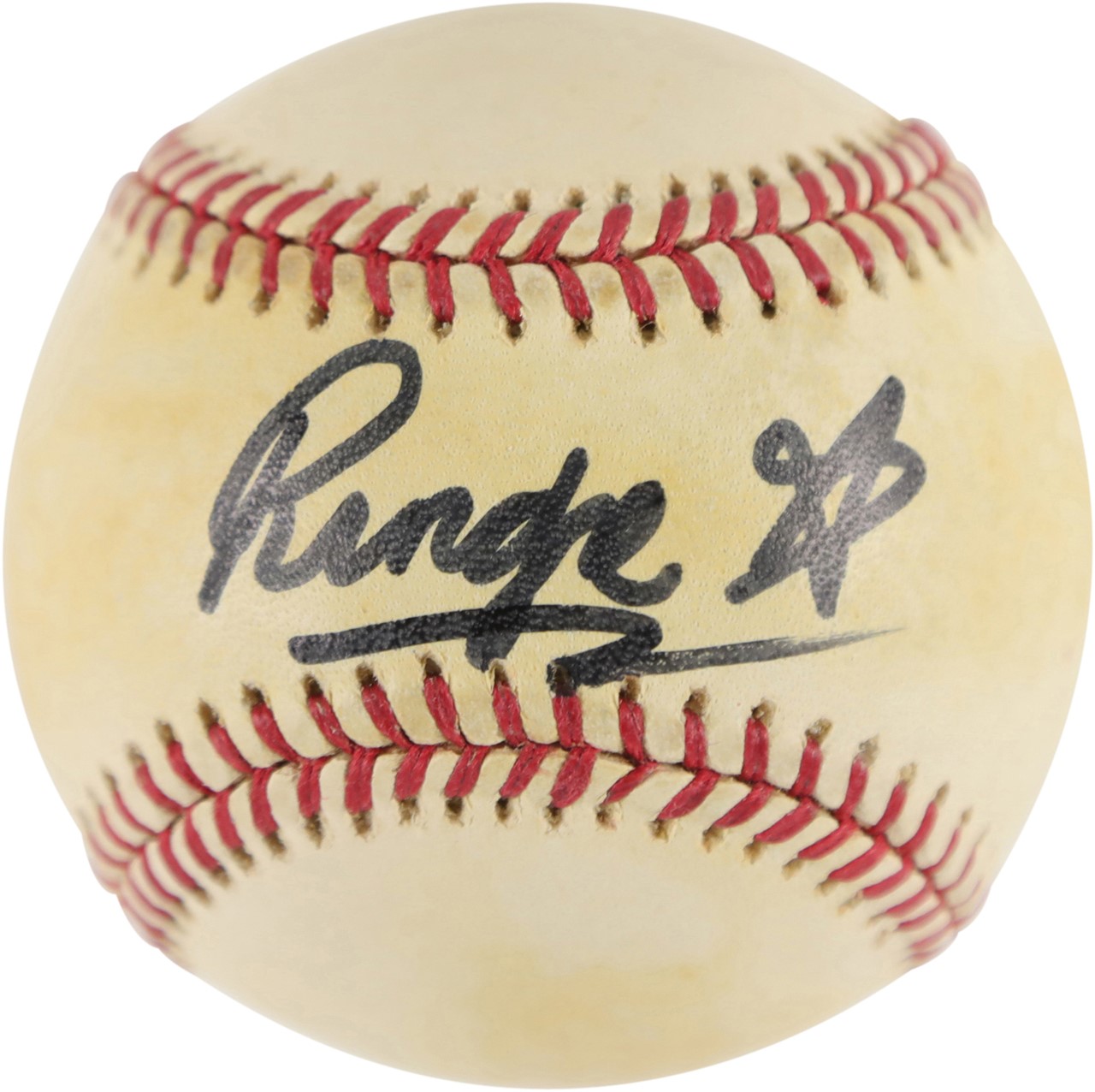 Crisp Ringo Starr single-signed baseball, obtained in person by a former Chicago White Sox scout who met Ringo after a show that he played in Chicago and got the ball signed after. Official American League (Budig) ball appears to have some dirt staining, possibly from being "rubbed up" as a game ball, but does not appear to show any signs of damage. Sweet spot signature is 9-10/10 and has "Ringo" with a star in bold, black marker. The former Beatles' drummer turned 80 in 2020 and has not signed autographs since 2008, so this lot in this condition is an increasingly-rare opportunity.