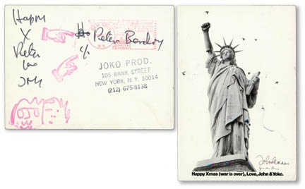 "Happy Xmas (war is over) Love John & Yoko" real photo postcard. On verso, written in black marker "Happy X(mas) Peter...Love John." Below he has added red rubber stamp with classic caricature, by John, of him and Yoko. To the right he has addressed it to Peter B c/o and hand stamped address "Joko Prod. 105 Bank Street New York NY 10014 (212) 675 8138" (their own company obviously). Two red hand-stamped hands point to the Statue of Liberty with 1960s militaristic fist with flying birds that surround her; John Lennon has drawn in black birds with matching marker to the one on the verso. Postcard sized and overall Excellent (sig. is nice).