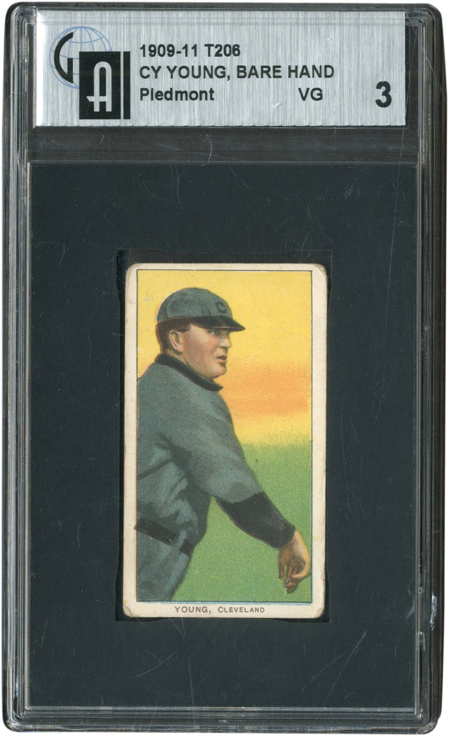 The greatest pitcher of all time is pictured in this remarkable fresh to market T-206. Clean Piedmont Cy Young Bare Hand example presents in GAI VG 3 condition.