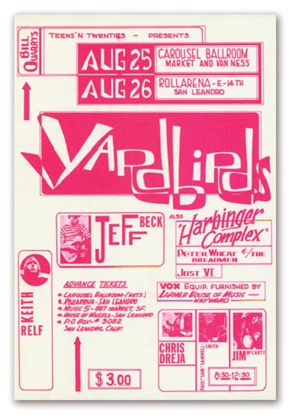 8.5x11". Here's an historic handbill for the Yardbirds appearing on August 25 - 26 at the Carousel Ballroom in San Francisco, California and at the Rollarena in San Leandro. NRMT.