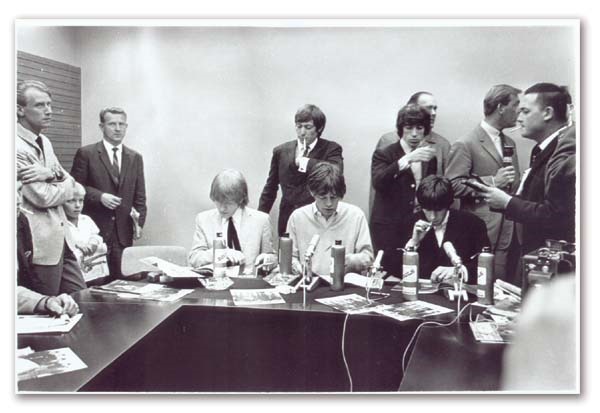 Set of nine black & white photographs, circa mid 1960's: a very young Stones group during a press conference, plus outside shots and others showing their adoring fans welcoming Mick and the boys to Holland. Four 8x10"s and five 9x12"s constitute this lot, with some duplication. Photos by Meeren.