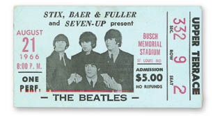 After playing the afternoon make-up show in Cincinnati, the group flew on to St. Louis for the evening concert. 23,000 braved rain at Busch Stadium, home of the baseball and football Cardinals. The Beatles played beneath a protective tarpaulin.