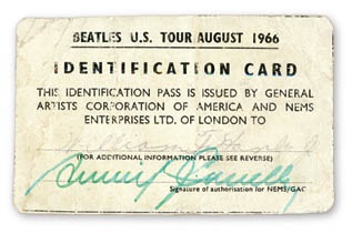 These GAC/NEMS issued ID passes were valid at all 14 North American tour stops. Security was extremely tight on this final concert tour amidst the controversy surrounding John's much publicized comments on Christianity. While Lennon's words were taken out of context, Beatles' manager, Brian Epstein, seriously considered canceling the tour out of a serious concern for the group's physical well-being. This ID pass is of particular interest as it was issued to William Hanley of Hanley Sound, owner of the company contracted to supply the amplification and public address systems. Only a few of these around! Moderate creasing.