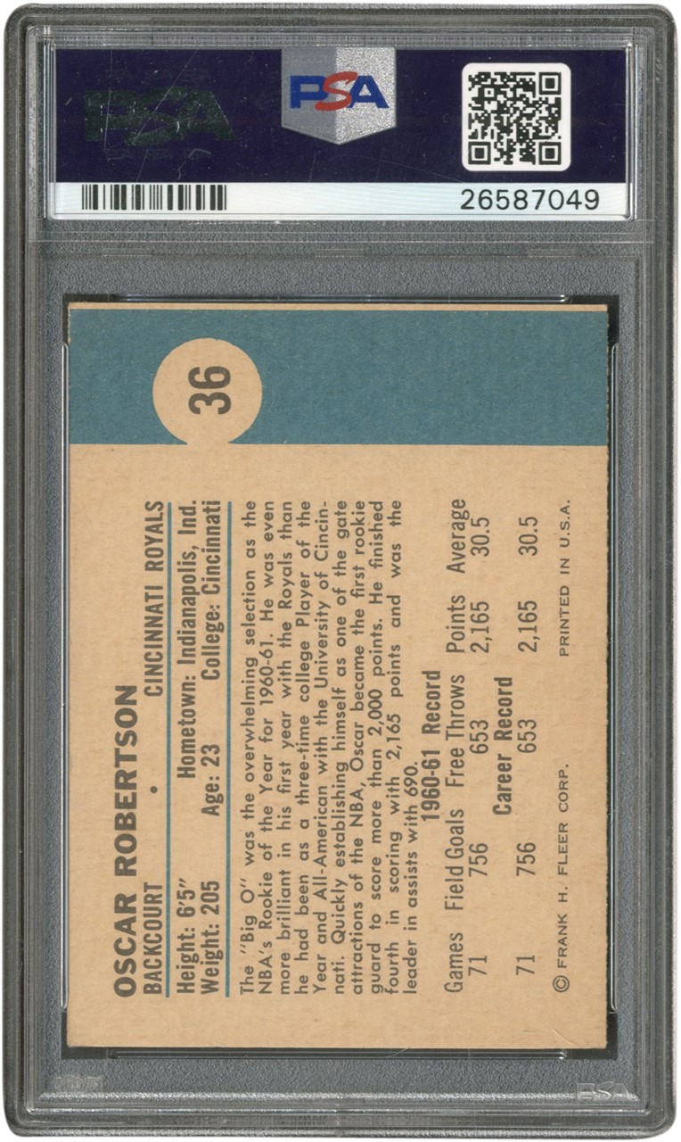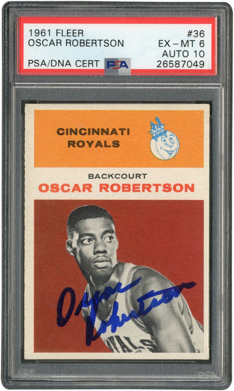 Pop 5 with only three graded higher, this sought after 1961 Fleer #36 Oscar Robertson features a crisp blue signature and has been graded EX MT 6 with a 10 auto. Recently graded and fresh to market, this fine example is sure to find a new home soon.