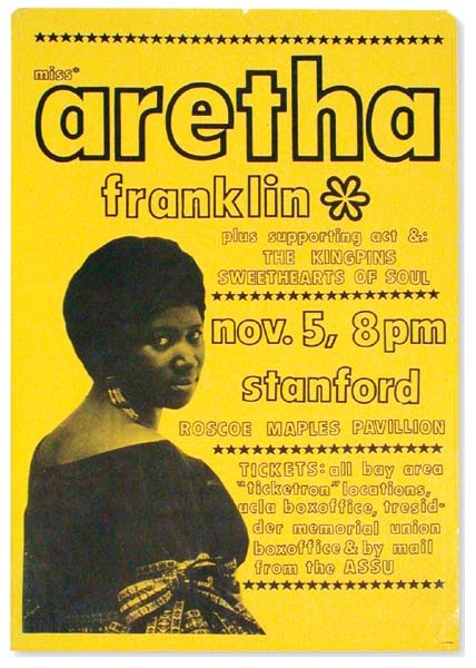 The undeniable Queen of Soul, Miss Aretha Franklin appeared November 5th at Stanford University in Palo Alto, CA. A striking poster of Lady Soul, circa early 70's. VG+ staple holes and corner wear. 11 x 17".