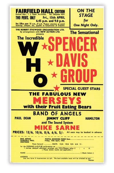 The incredible Who, the sensational Spencer Davis Group and others performed two shows at Fairfield Hall in Croydon, UK on April 15th, 1966. This very rare ticket order form handbill announces these shows.