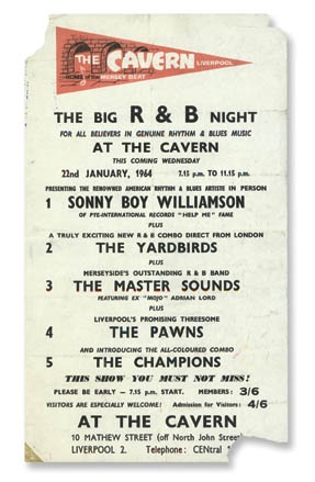 All the British rock stars will tell you that one of their main influences was Sonny Boy Williamson. In 1964 he tour the UK and performed on January 22nd at The Cavern in Liverpool (made famous by The Beatles) along with The Yardbirds and others. Eric Clpaton was a Yardbird at the time and sights Soony Boy as major influnce on his music. VG, folded and missing three corners but so rare and very presentable.