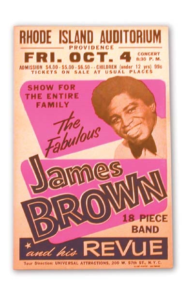 14x22.5". Beautiful cardboard boxing style poster for the appearance of the Godfather of Soul, the fabulous James Brown and his Revue in Rhode Island. NRMT.