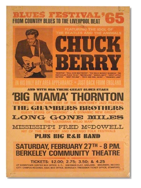 This classic boxing style poster announces Blues Festival '65 featuring "The Idol of The Beatles and The Animals," Chuck Berry (just back from England), Big Mama Thornton (the "Hound Dog" girl), the Chambers Brothers and more at the Gerkeley Community Theatre. VG+, staple holes, nicely aged.