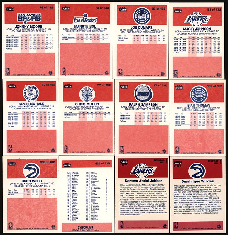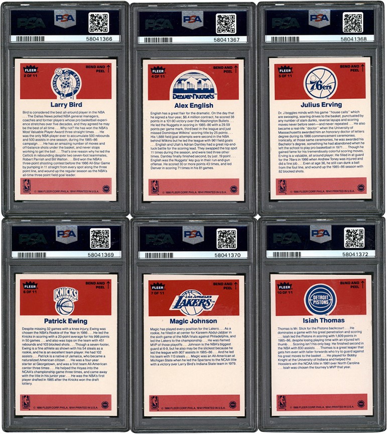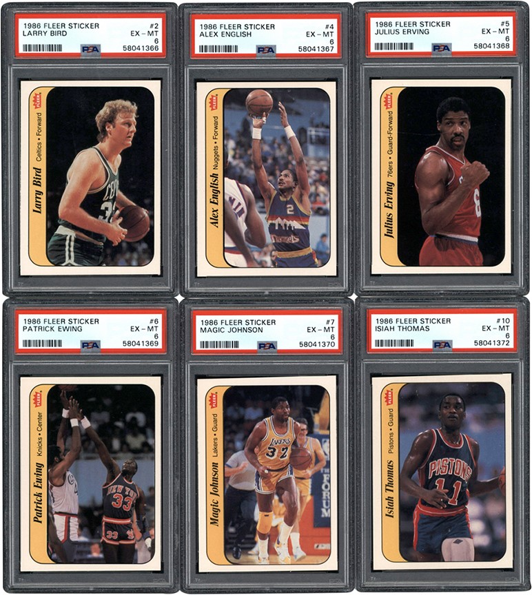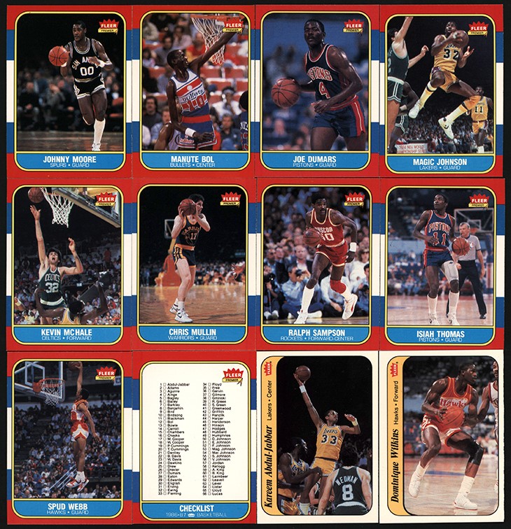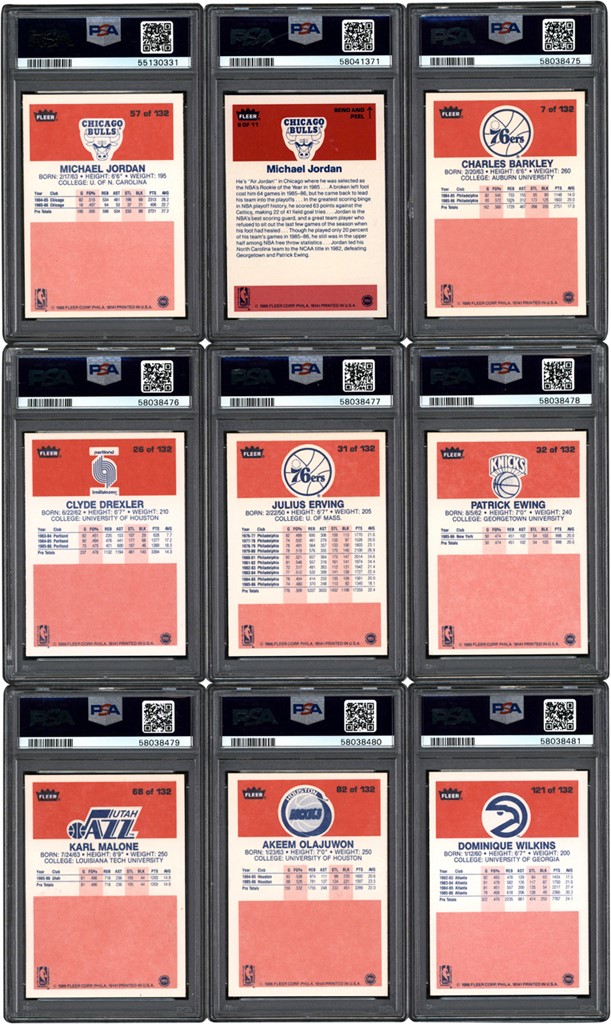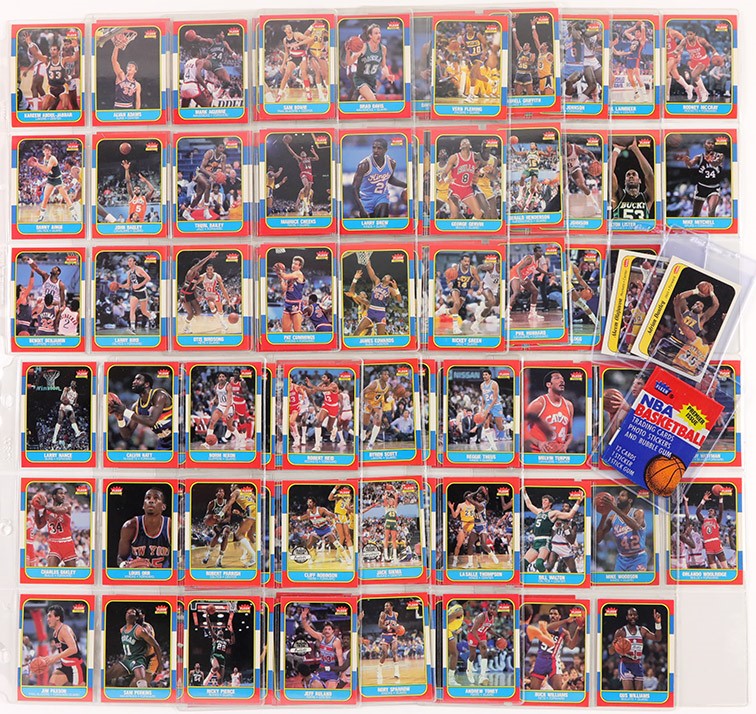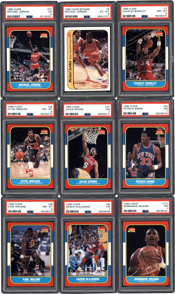 1986-87 Fleer Basketball Complete Set of (132) card and (11) stickers. (15) cards have been graded and encapsulated by PSA with: #7 Barkley (R) NM-MT 8; #26 Drexler (R) NM-MT 8; #31 Erving NM 7; #32 Ewing (R) NM 7; #57 Jordan (R) EX 5; #68 K Malone (R) NM-MT 8; #82 Olajuwon (R) NM 7; #121 Wilkins (R) NM 7; Sticker #2 Bird EX-MT 6; #4 English EX-MT 6; #5 Erving EX-MT 6; #6 Ewing EX-MT 6; #W7 Johnson EX-MT 6; #8 Jordan EX-MT 6; #10 Thomas EX-MT 6. Other highlights include: #1 Abdul-Jabbar EX-MT; #4 Ainge (R) NM-MT (OC); #9 Bird VG-EX; #12 Bol (R) NM-MT (OC); Dumars (R) NM-MT (OC); Magic Johnson NM (OC); #73 McHale NM; #77 Mullin EX-MT; #97 Sampson (R) NM-MT (OC); #109 Thomas (R) NM (OC); #120 Webb (R) NM-MT (OC); #131 Worthy (R) EX-MT; #132 Checklist NM (OC). Sticker #1 Abdul-Jabbar NM-MT; #9 Olajuwon NM; #11 Wilkins NM (OC). Overall condition breakdown is 10% EX; 15% EX-MT; 55% NM; 20% NM-MT. Centering is the main condition issue.