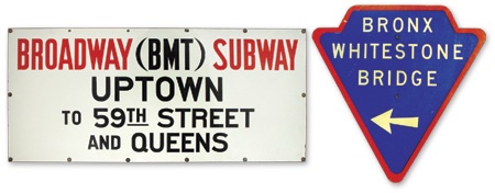 These old relics used to direct inhabitants of the Big Apple. One, in the shape of an upside-down triangle, reads “Bronx Whitestone Bridge”. Painted blue, orange & white and measures 29x30” at its greatest points. The other, a rectangle, reads “Broadway (BMT) Subway Uptown to 59th Street and Queens”. Painted white, black & red and measures 19.5x43.5”. Both are in Excellent condition, relatively unscathed by the forces of nature.