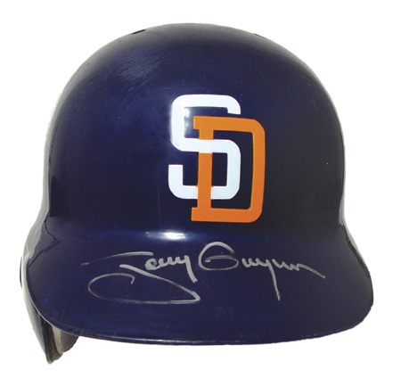 Tony Gwynn, very cognizant of his hit numbers recorded numbers 3030 and 3031 in this batting helmet, 9-3-99 against Florida. He put his signature in silver sharpie on the visor and wrote "9-3-99 vs. Fla 3030/3031" on the inside. #19 sticker on the back. Helmet is a Diamond Collection size 7 1/8. Shows great use.